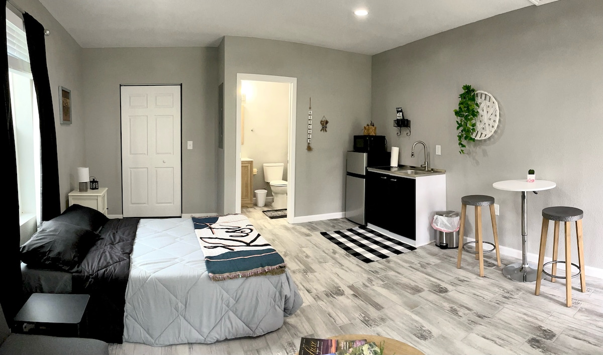 Enjoy your stay at this shady oak guesthouse. It is located on our 2 acres of land with the view of a neighboring lake. Don’t let the size fool you, it has a queen size bed, small kitchenette with fridge, microwave and coffee. The eating area can double as a workspace if needed. It has a full-size bathroom as well. It has a brand new ac and air purifier. It has outdoor seating, privacy fence and keyless entry. Minutes away from JIA, River City Marketplace, the Zoo and the Cruise terminal.