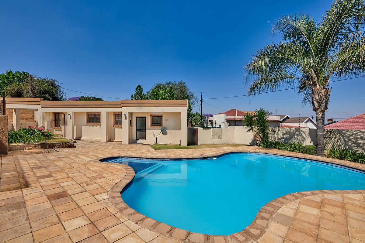 Við erum staðsett í Randhart Alberton. Heimilið okkar er fjölskylduheimili í gömlum stíl. Við erum með 3 svefnherbergi og 2 baðherbergi . Hvert baðherbergi er með sturtu, handlaug og salerni. Hvert herbergi er með hjónarúmi og rúmar tvo einstaklinga. Það er fullbúið eldhús með ofni, eldavél og örbylgjuofni. Uppþvottavél í boði. Setustofa og borðstofa og rúmgóð. Rennihurðir úr viði liggja að opinni verönd og sundlauginni. Örugg og örugg bílastæði. Nálægt helstu þjóðvegum og verslunarmiðstöðvum.