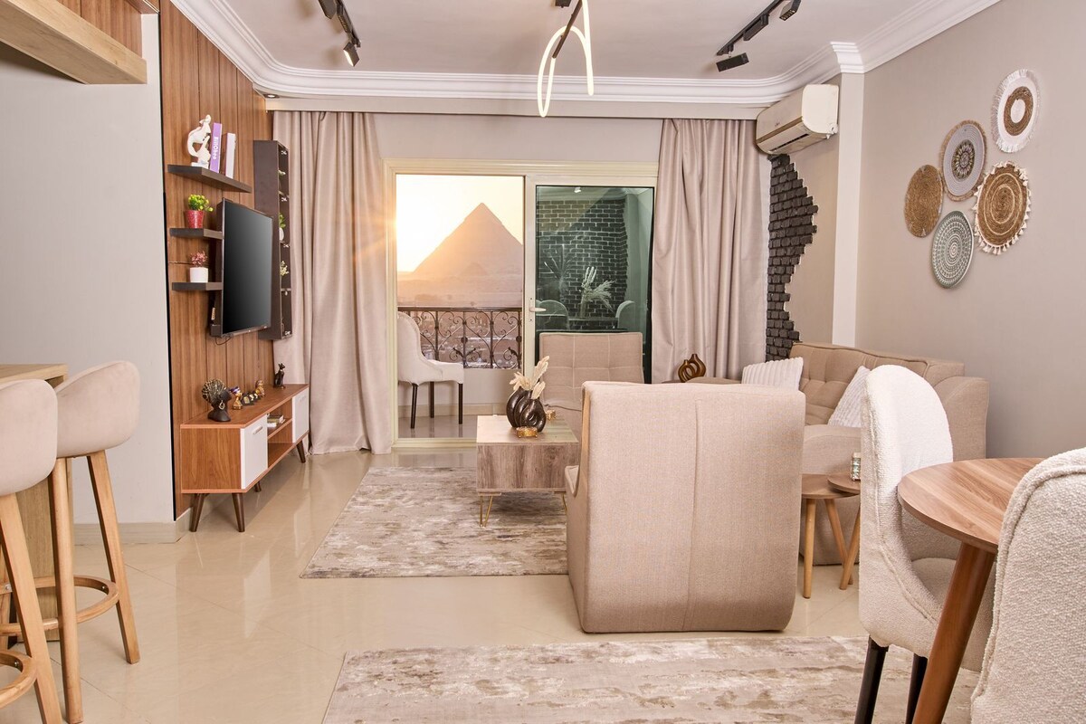 Gistu í hreinni, tveggja herbergja íbúðinni okkar í aðeins 5 mínútna fjarlægð frá pýramídunum og nýja safninu. Á heimilinu okkar er fullbúið eldhús og notaleg stofa. Njóttu háhraðanettengingar og 55 tommu snjallsjónvarps. Þægilega staðsett með greiðan aðgang að áhugaverðum stöðum og nálægt verslunum, veitingastöðum og kaffihúsum. Við bjóðum upp á öryggi allan sólarhringinn og innritun allan sólarhringinn. Við hlökkum til að taka á móti þér og hjálpa þér að eiga eftirminnilega dvöl hjá pýramídunum.