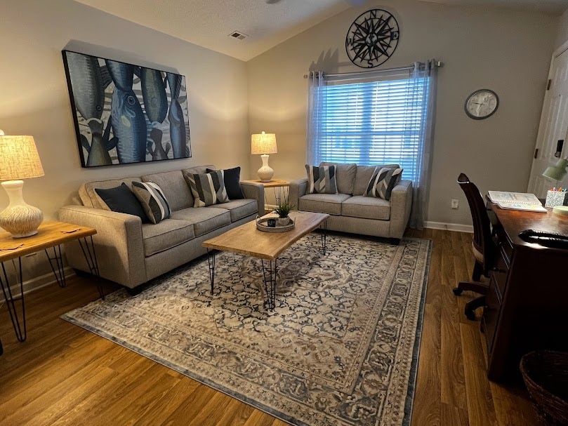 Rólegt Inlet-svæði nokkrum skrefum frá hjólastíg sem liggur að Marshwalk og höfninni. Engar stigar! Einkaverönd í bakgarði með gæludýri hlið tengt! Tvö svefnherbergi, eitt baðherbergi, allt út af fyrir þig. Rúm af king-stærð! Ókeypis bílastæði. Hvíldarsófi úr leðri! Handan við götuna frá Waccamaw-sjúkrahúsinu í Tidelands. Þú þarft ekki að keyra! Göngufæri að matvöruverslun, verslun, kirkjum, afþreyingu og flestum þægindum sem þú gætir óskað þér. Dunkin er hinum megin við völlinn fyrir morgunmat! Reiðhjól í boði með bókun! „Hætt við!“