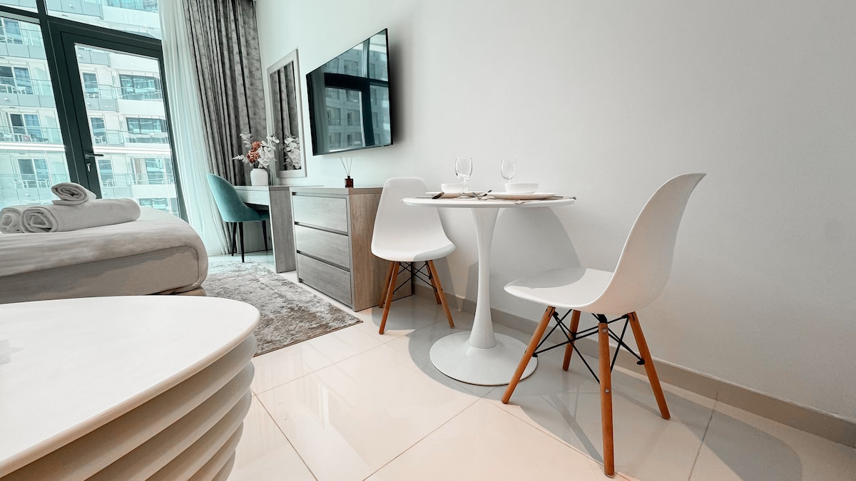 Nútímalegt stúdíó í Seven Palm, Palm Jumeirah. Bjart og fágað rými með queen-size rúmi, sófa, snjallsjónvarpi, skrifborði, borðstofu og fullbúnum eldhúskrók. Flott baðherbergi með þægindum í boði. Gestir njóta endalausrar sundlaugar á þakinu með mögnuðu útsýni yfir sjó og sjó, líkamsræktaraðstöðu, beins aðgangs að strönd og öryggisgæslu allan sólarhringinn. Skref frá Nakheel Mall, veitingastöðum og strandklúbbum. Fullkomið fyrir pör, ferðalanga sem eru einir á ferð eða gesti í viðskiptaerindum sem vilja þægindi og stíl.