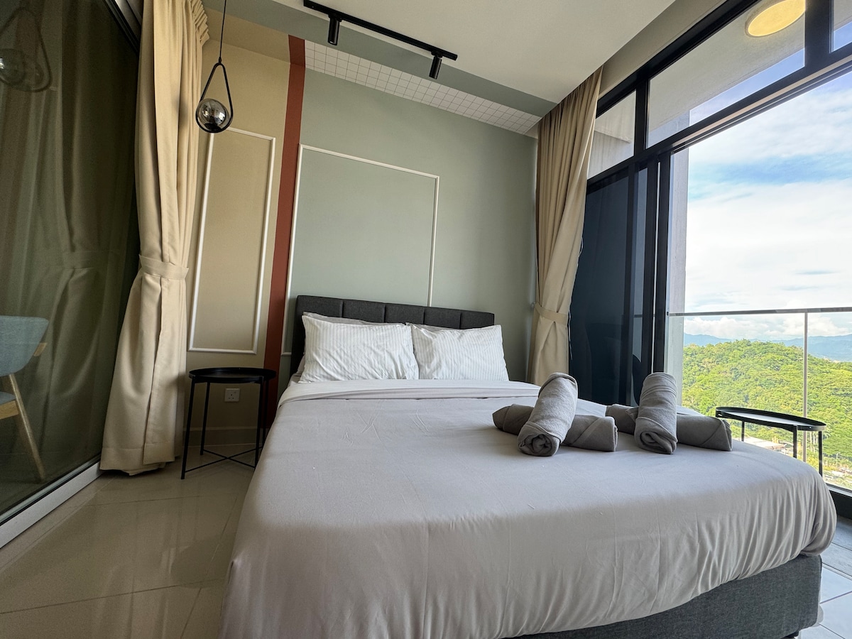 Stunning Sea view from the house. Chilling at the balcony. Swimming pool@level 6 Living Room, Queen Size bedroom, private sofa bed corner with curtains. Ensuite bathroom with hot and cold water shower. Large refrigerator with ice cube , mini kitchen with electric cooker, pot,plate,spoon,fork are available . Light cook at the kitchen. Filter water machine hot and warm. Please select 3 guest if you need single bed setting convert from sofa bed.