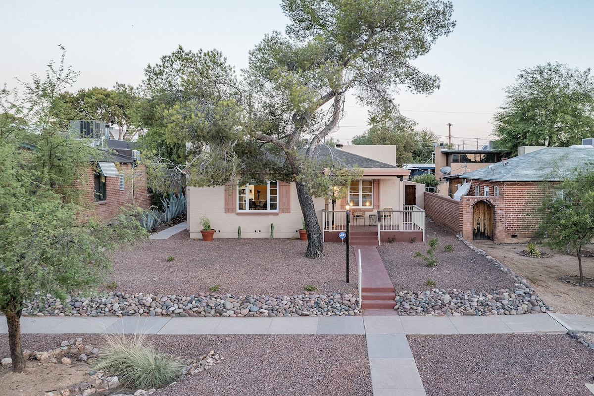 ✓ Retro appliances ✓ Well-equipped/stocked kitchen ✓ Wifi & smart TV ADDITIONAL FEE: To preserve the condition of our property, a refundable Safety Deposit ($700) or non-refundable Damage Waiver ($42.80) is REQUIRED. After booking, you'll receive a Boarding Pass link via Enso Connect, an AUTHORIZED AIRBNB PARTNER, to provide your name, phone, and email, and choose either the Safety Deposit or Damage Waiver. 3 min → U of A (walkable/bikeable) 3 min → Downtown Tucson 25 min → Sabino Canyon