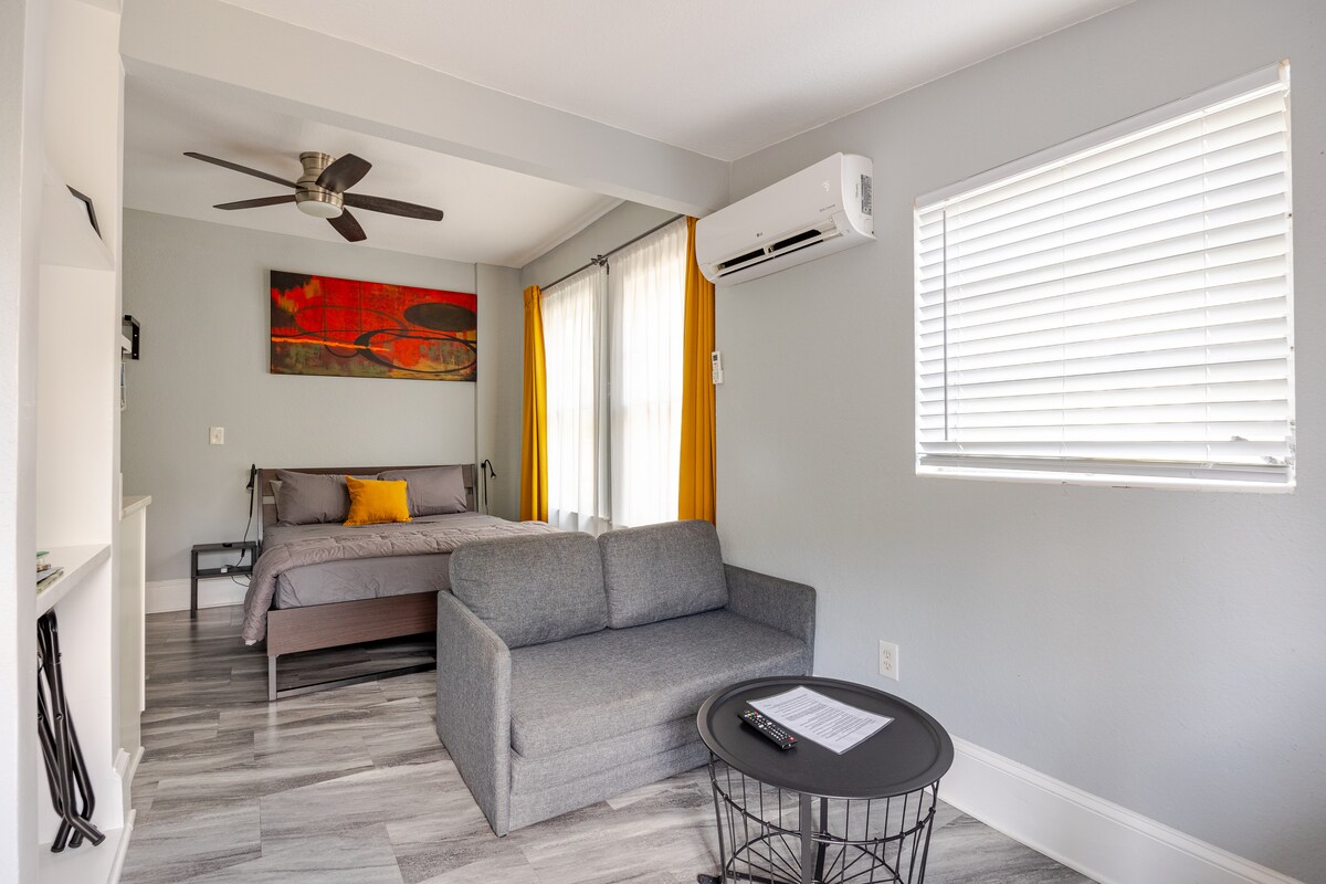 Upplifðu það besta sem Orlando hefur að bjóða frá þessari einkagistingu með einu svefnherbergi í hjarta miðborgarinnar! 🌆 Gakktu að vinsælum veitingastöðum, börum og Eola-vatni — en njóttu þó friðar og næðis í rólegri götu. ☕ Ókeypis kaffi, 🚗 ókeypis einkabílastæði (sjaldgæft í miðbænum!), ⚡ hröð þráðlaus nettenging, 💻 skrifborð fyrir fjarvinnu og notalegt KING SIZE rúm gera það tilvalið fyrir vinnu- eða frístundagistingu. Fullkomin blanda af þægindum, þægindum og staðsetningu — allt sem þú þarft aðeins skref í burtu!