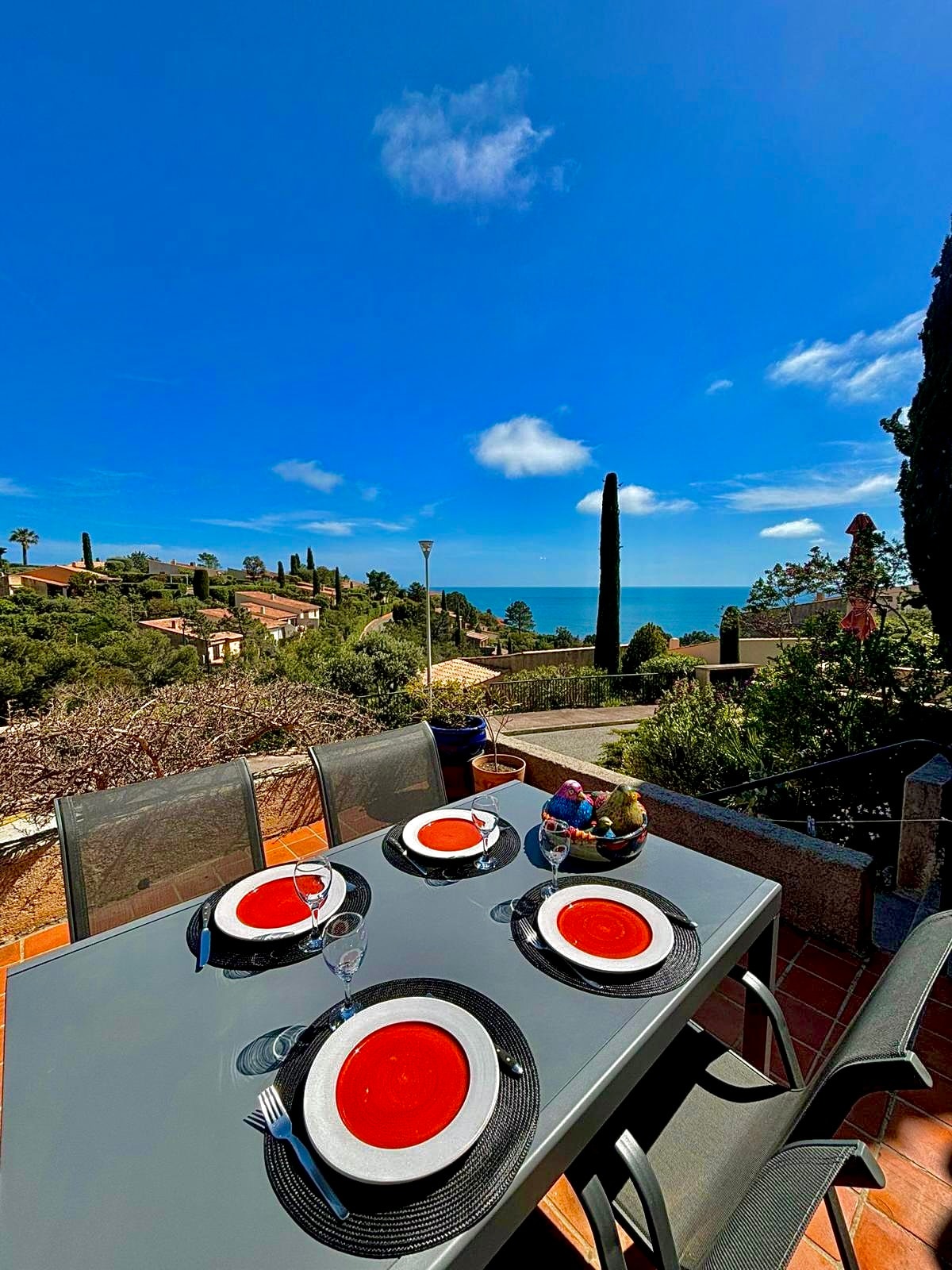 50 m² íbúð í tvíbýli með sundlaug og mögnuðu sjávarútsýni, fullkomlega endurnýjuð og loftkæld, hún samanstendur af eldhúsi sem er opið stofu/borðstofu, svefnherbergi með svölum, baðherbergi með sturtu og salerni, aðskildu salerni/vaski á jarðhæð, yfirbyggðri verönd með borði og einkabílskúr. Landfræðileg staðsetning veitir þér beinan aðgang að tómstundum á sjó og göngustígum í Estérel-garðinum. Aðstaða: Þráðlaust net, loftræsting.