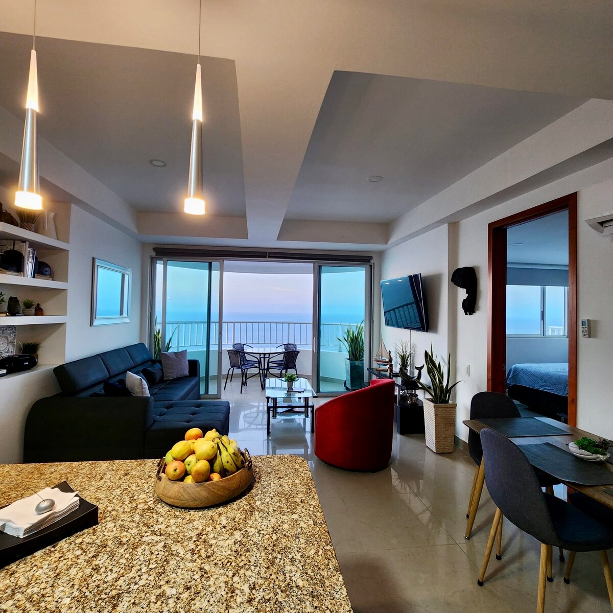 Glæsilega íbúðin okkar er staðsett í einni fullkomnustu og nútímalegustu byggingunni í „Cielo Mar“ geiranum. Þú verður aðeins nokkra metra frá „Playa Azul“, einni af bestu ströndum borgarinnar, í 10 mínútna fjarlægð frá sögulega miðbænum og í aðeins 5 mínútna fjarlægð frá flugvellinum. Íbúðin er með ótrúlegt útsýni yfir flóann og sjóinn sem þú getur notið frá einkanuddpottinum á svölunum hjá þér. Þú getur einnig notið ótrúlegra sundlauga á þakinu með heitum potti, gufubaði, bar með verönd og grilli