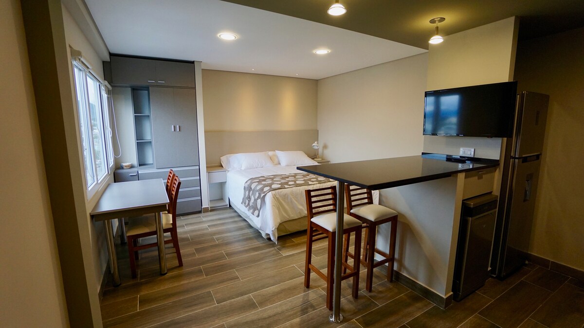 Stúdíó með pláss fyrir allt að 3 gesti, 2 TWN rúm eða 1 DBL MOTTU með möguleika á að bæta við aukarúmi fyrir barn upp að 10 ára aldri. Það er staðsett 1 húsaröð frá aðalstræti miðbæjar San Martín. Fullbúið eldhús með kaffivél, brauðrist, örbylgjuofni og nauðsynlegum eldhúsáhöldum. Uppþvottalögur fyrir allt að 3 manns og morgunverðarbar með gangstéttum. Inngangur í sal með skilti. Baðherbergi með sturtu. Heimili þitt að heiman Útsýni yfir Mount Susana
