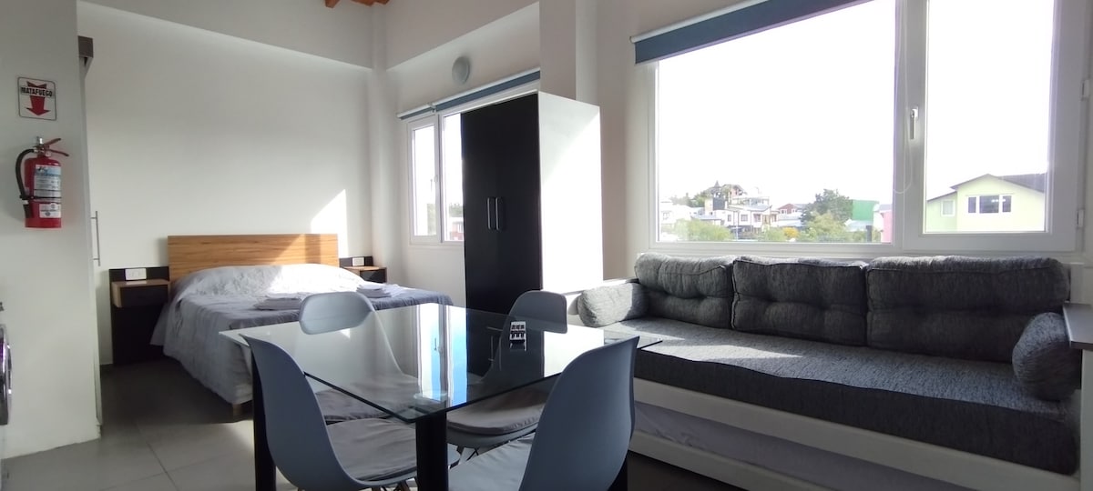 Njóttu þægilegrar og hagnýtrar dvalar í þessu bjarta umhverfi með útsýni yfir fjöllin, í aðeins 400 metra fjarlægð frá miðbæ Ushuaia. Eignin er tilvalin fyrir pör eða tvo ferðalanga og aðlagast þörfum þínum: hún er með hjónarúmi eða tveimur einbreiðum rúmum, vel búnu eldhúsi, geislahitun og interneti. Þú ert einnig steinsnar frá stórmarkaði, apótekum, matarhúsum og fleiru. Við vonum að upplifun þín í Ushuaia verði ógleymanleg!