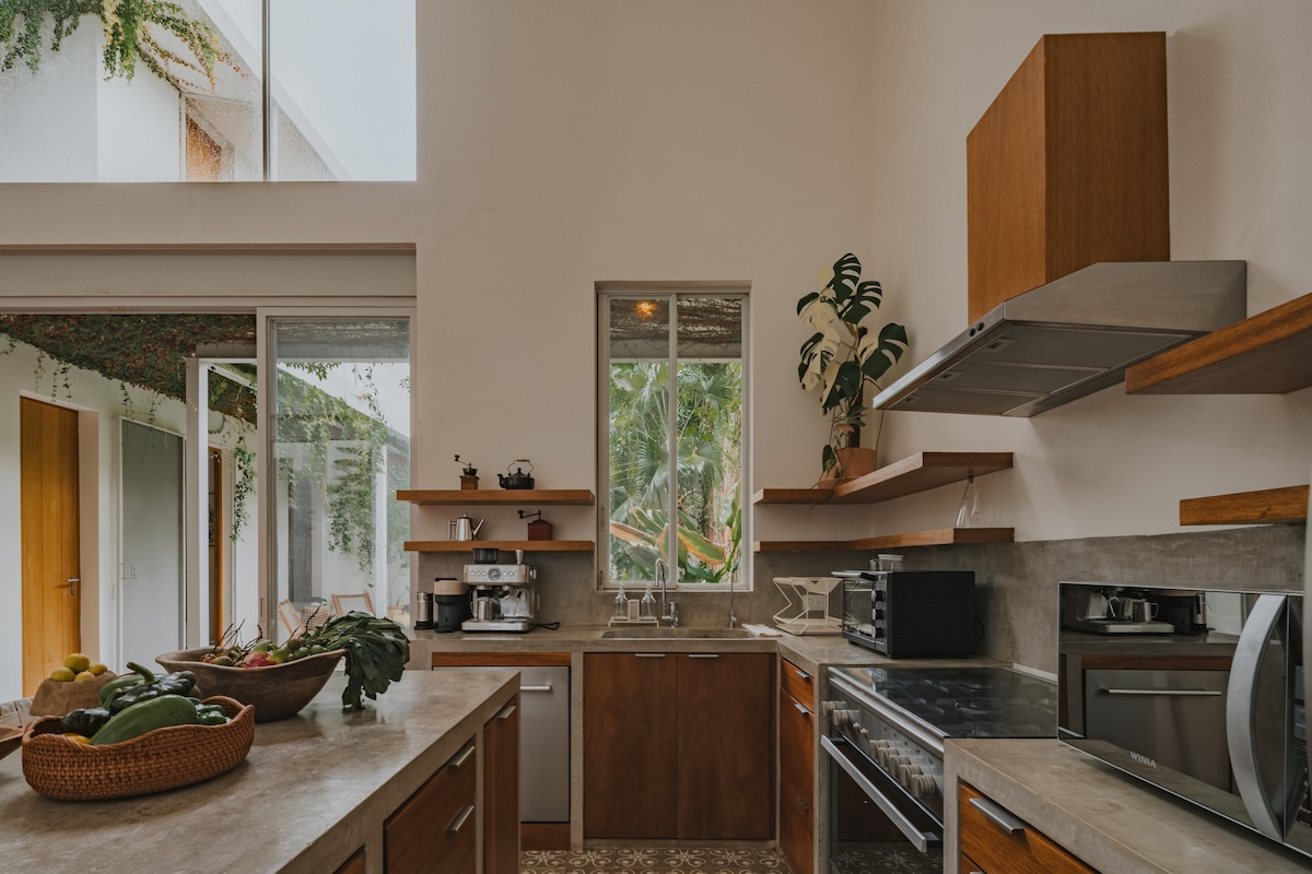 Þetta fullbúna, einka- og íburðarmikla hús er með tvö svefnherbergi og öll þægindin sem þú þarft til að njóta fullkominnar dvöl í fallegu Mérida. Þessi eign er staðsett í miðborginni og er útbúin til að tryggja þér algjör þægindi, þar á meðal loftkælingu, loftviftum, svalandi sundlaug og drykkjarhæfu vatni í eldhúsinu. Svefnherbergin eru með king-size rúmi, einkaverönd, fullbúnu baðherbergi, skáp og 100 mb/s nettengingu.