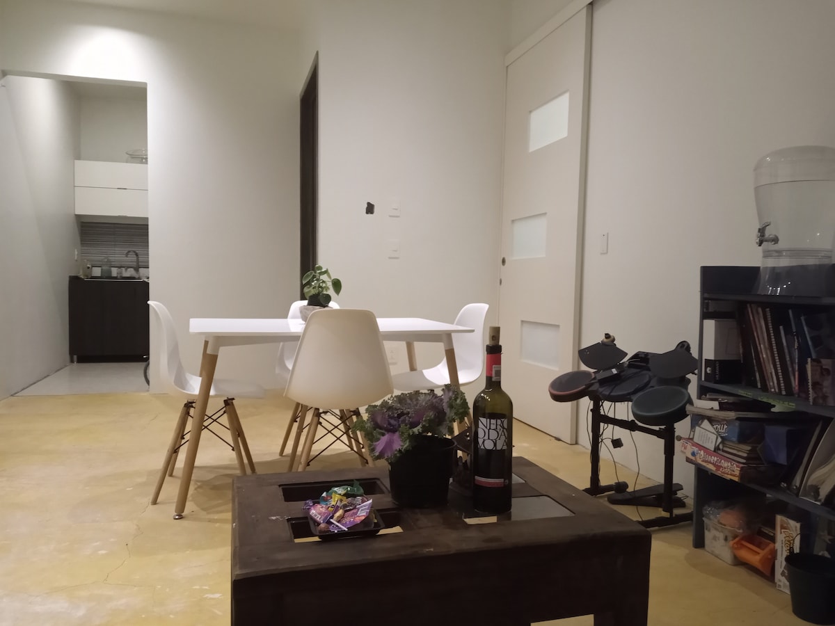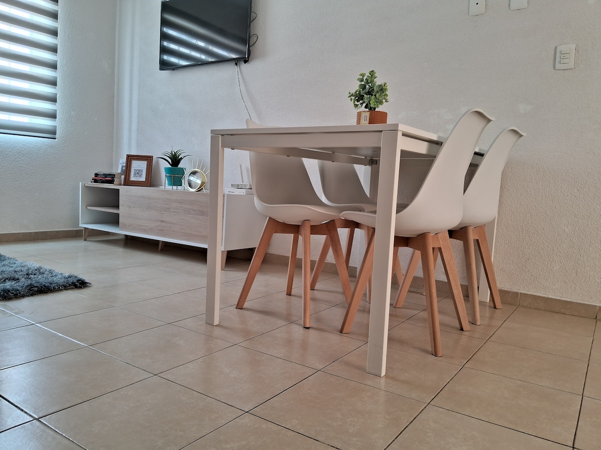 Slakaðu á í glænýrri, notalegri íbúð okkar, sem er fullkomlega staðsett nálægt bifreiðamiðstöð Puebla, í aðeins 10 mínútna fjarlægð frá flugvellinum og í 20 mínútna fjarlægð frá Val 'quinico. Hentar litlum fjölskyldum og viðskiptaferðamönnum. Njóttu þæginda á borð við þráðlaust net, sjónvarp, fullbúið eldhús, svefnherbergi í queen-stærð, svefnsófa, sérstaka vinnuaðstöðu og fullbúið baðherbergi. Auk þess býður örugga samstæðan okkar upp á græn svæði og þægilegar verslanir sem henta vel fyrir gönguferð dag sem nótt.