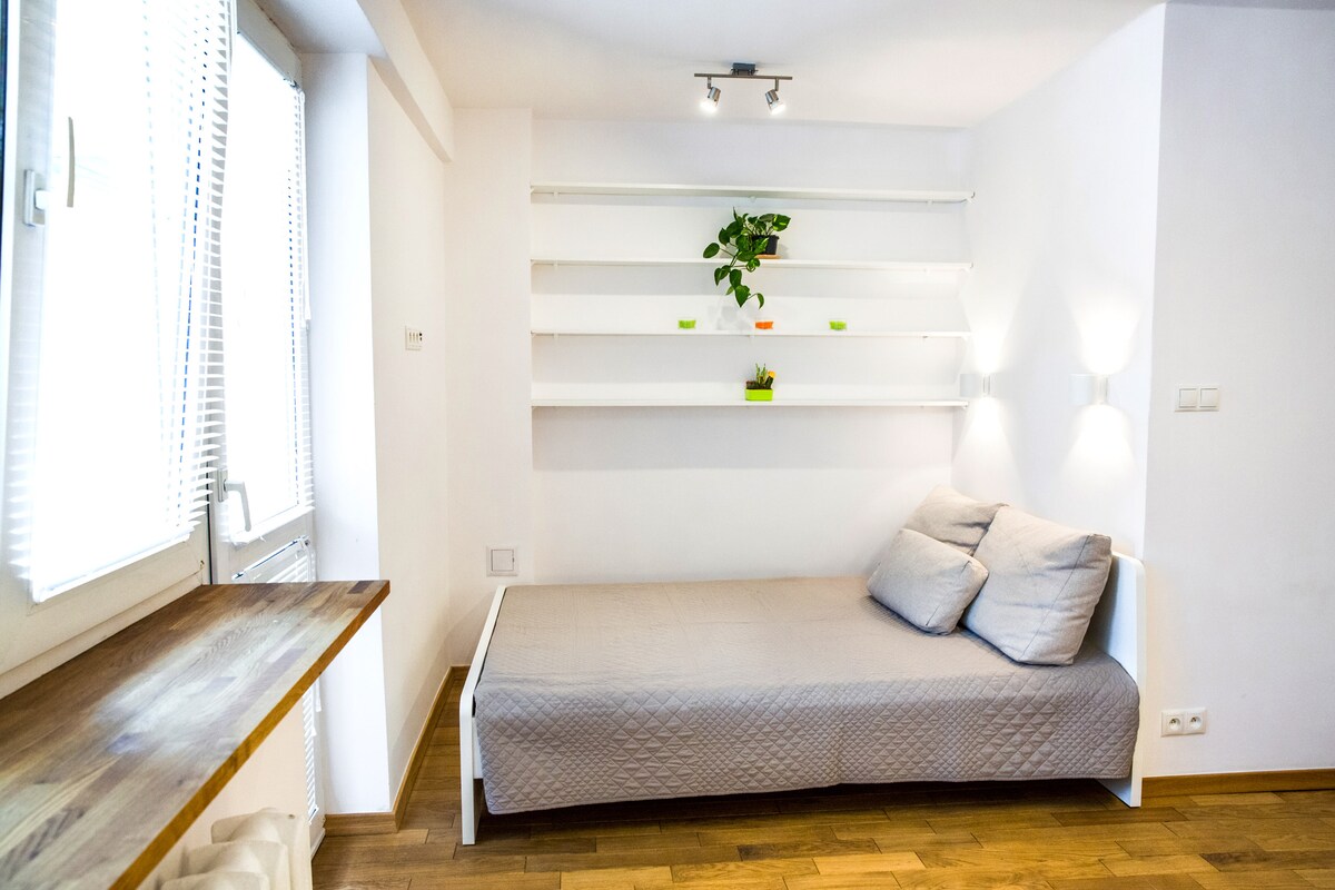 Bright, clean and cozy 2-level studio (26m2). Down: bathroom, kitchen, living room, comfy sofa, desk by a 3-meter window. Top: comfy double bed, wardrobe, desk. The studio is fully equipped (there's also wifi). It is located in a quiet area next to the Royal Route (the most representative part of Warsaw). Park, shops, restaurants, gym closeby. It's just perfect for: -tourists looking for a starting point for sightseeing -business travelers -people looking for a cozy and quiet place to rest :)