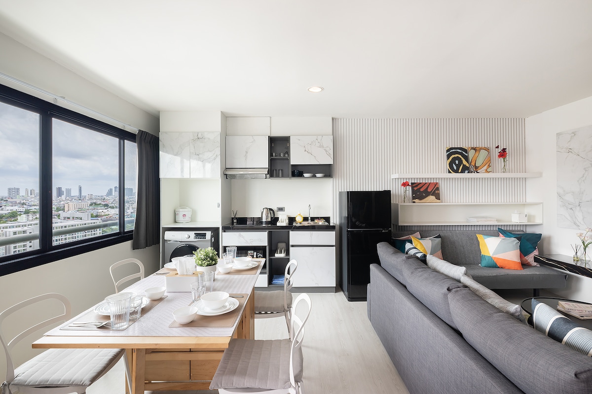Njóttu notalegs og rúmgóðs rýmis í þessari sjaldgæfu íbúð í dvalarstaðarstíl í Bangkok. Vaknaðu með góða sundlaugargolu og útsýni yfir sjóndeildarhringinn úr svefnherberginu okkar Umkringdur menningu á staðnum, götumat, kennileitum í Bangkok og mörgu fleiru. Staðsett rétt hjá Krung Thon Buri BTS stöðinni auðveldar samgöngur og allt er aðeins í burtu Tilvalið fyrir ferðamenn og fjarvinnufólk með fullum grunnþægindum, þar á meðal vinnurými og frábæru þráðlausu neti. Njóttu ókeypis aðgangs að sundlauginni, líkamsræktinni og mörgu fleiru
