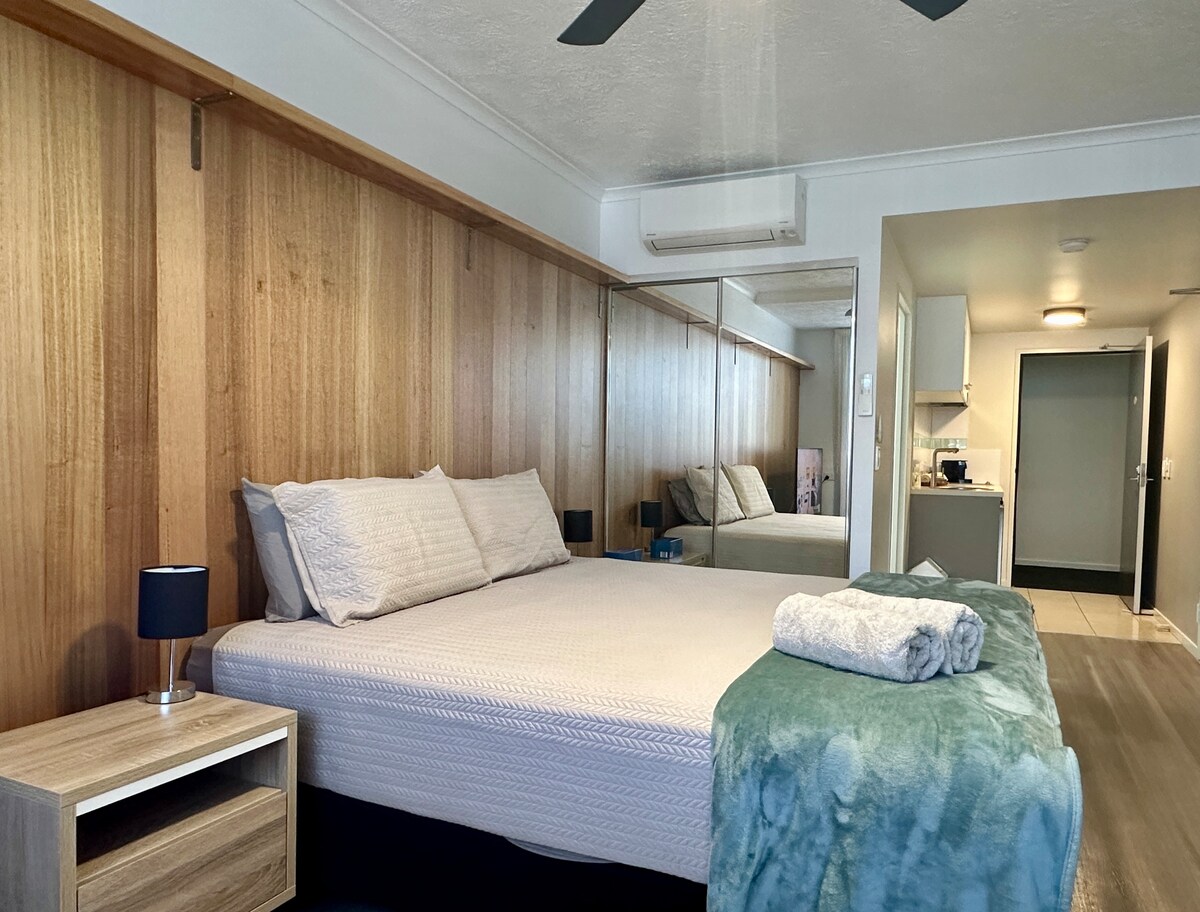 Located in the very heart of the city, is this self contained studio apartment. New king size bed, 2 seat electric leather lounge and 55 inch 4k qled tv. This is a secure complex. The unit is bigger than usual for a bedsit, with enough room for a dual seat electric lounge/TV/eating area at one end of the room. There are cooking facilities, everything but an oven.