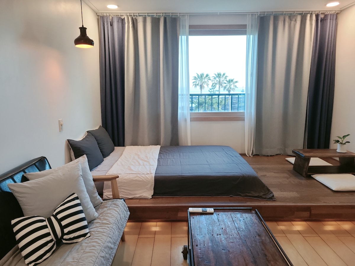 Hello. This is 'Badangkkot'. Located in Namwon-eup, which is known for its warmth and tangerines, and is one of the most famous areas in Jeju Island. You can take a stroll along the coastline on the Olle Trail No. 5 by foot. Nearby, there are convenience facilities such as supermarkets, convenience stores, and banks within a 3-minute walk, making it convenient for families and couples. You can enjoy the stunning ocean view and the sound of the waves from every room.