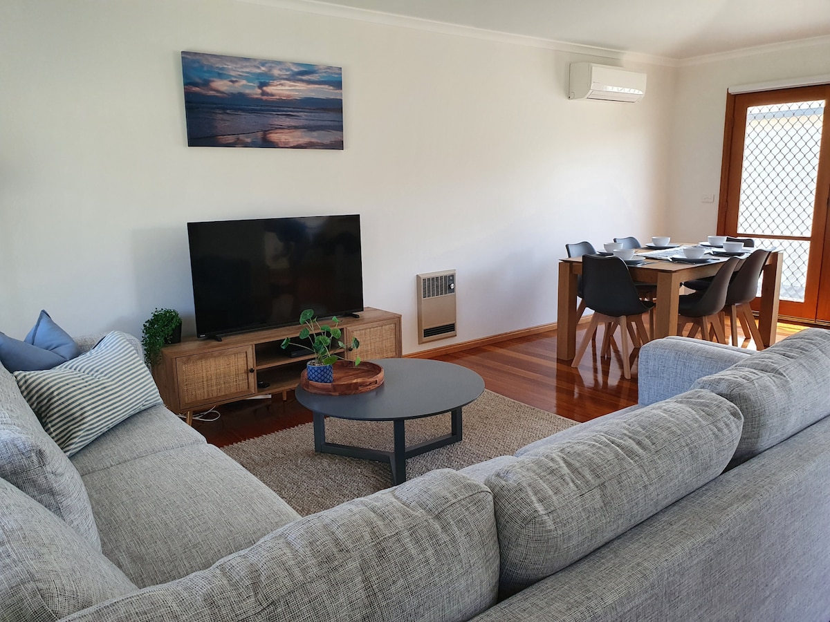Gakktu inn og slakaðu samstundis á! Ef það er „Surfs up“ á sumrin eða „notalegt“ fyrir veturinn með bragðgóða gasarinn okkar er hér fullkomið afslappað, áhyggjulaust og stílhreint frí í hinu friðsæla Surfcoast... Stutt gönguferð að brimbrettaströnd, verslunum, Barwon Heads River, leikfimi, veitingastöðum, brugghúsum og kaffihúsum. Eða stutt í golfvelli, víngerðir, ævintýragarð og aðra nálæga bæi við ströndina. Orton St Stays er þriggja svefnherbergja einbýlishús með bílskúr sem býður upp á frí fyrir pör eða fjölskyldur.