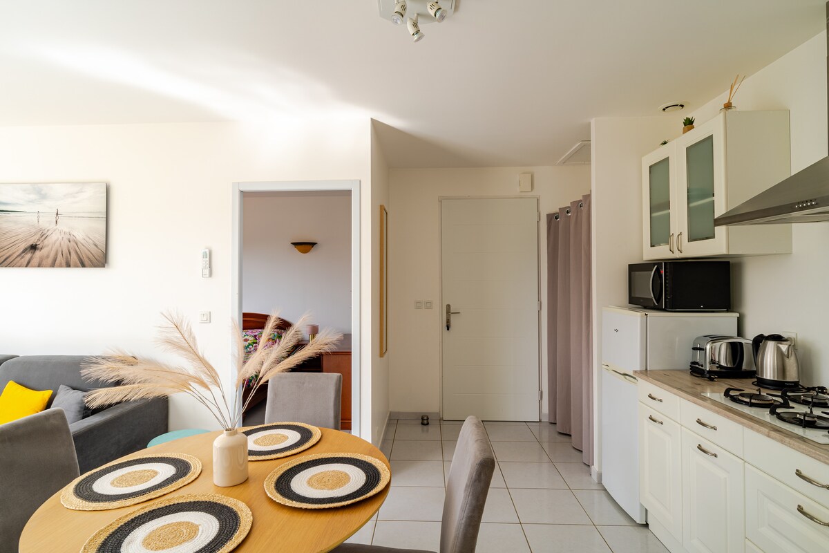 30 m2 íbúðin mín er staðsett við sjávarsíðuna milli ofurmiðjunnar og hafnarinnar og þar er pláss fyrir allt að 4 einstaklinga í öruggu húsnæði. Hann hefur verið endurbyggður og hefur verið hannaður til að veita þér hlýlegt og rólegt andrúmsloft með töfrandi útsýni yfir sjóinn. Þú getur borðað úti á stórri verönd. Bílastæði er frátekið fyrir þig á Miðjarðarhafsbílastæðinu. Ýmsar verslanir bíða þín við rætur húsnæðisins...