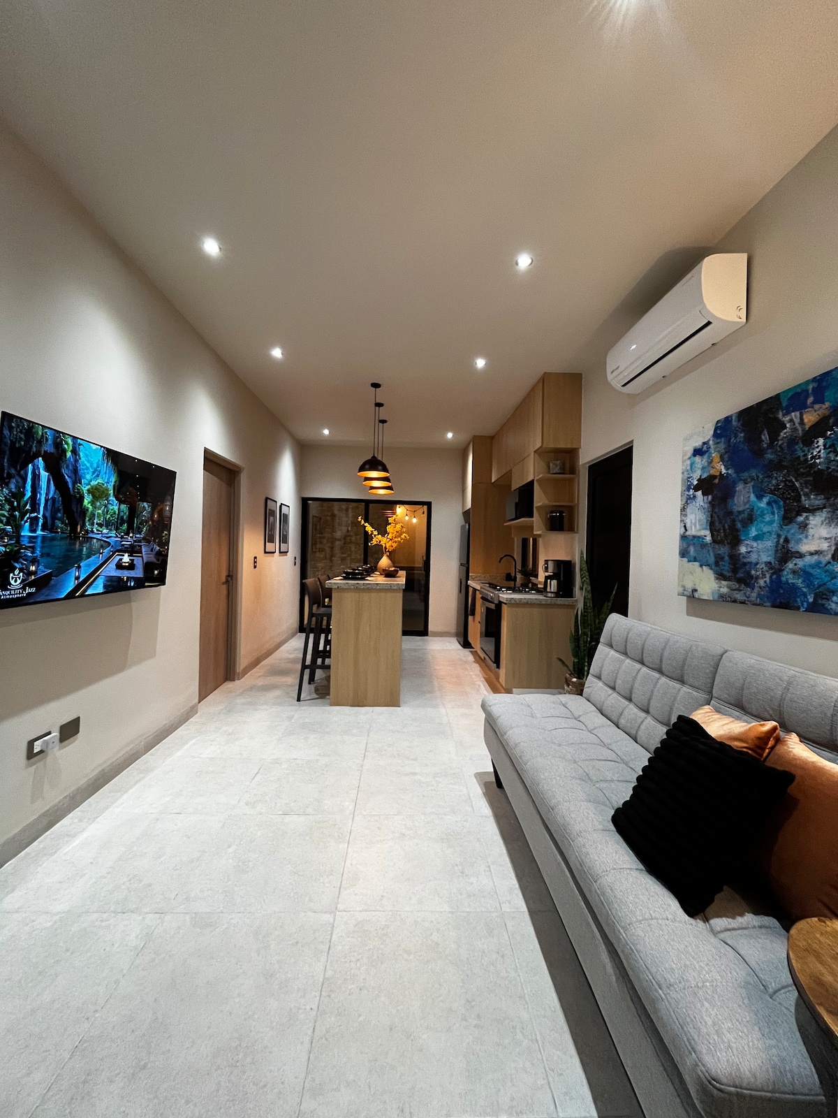 Slakaðu á í þessu rólega og stílhreina rými. Njóttu fullbúinnar og NÝRRAR íbúðar. 70"skjár á félagssvæðinu og 55" í herbergjunum. Rúmgóð baðherbergi, skápar, þvottahús, queen-rúm, minisplit's á öllum svæðum, vel búið eldhús og aðgengi að þaki með yfirgripsmiklu útsýni. Við sameinum góðan smekk og nútíma og þægindi. Nálægt veitingastöðum og matvöruverslunum. Njóttu dvalarinnar í íbúðinni okkar sem er hönnuð til að mæta þörfum þínum.