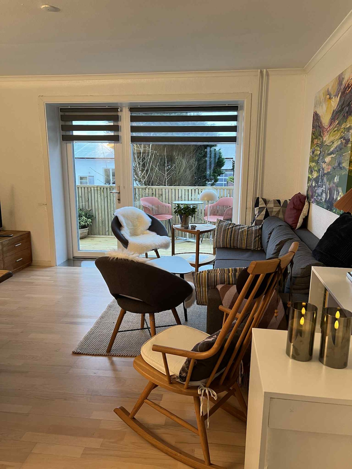 Small, bright and cosy apartment in a quiet neighbourhood in the heart of Torshavn with everything you need for a great stay. It is centrally located within walking distance from restaurants, cafés, shopping & cultural experiences. The apartment has a large private terrace, one bedroom, living room, a well-equipped kitchen, a large bathroom with heated floor, shower and washer. There is public parking right outside the front door, where you can park up to 8 hours for free.