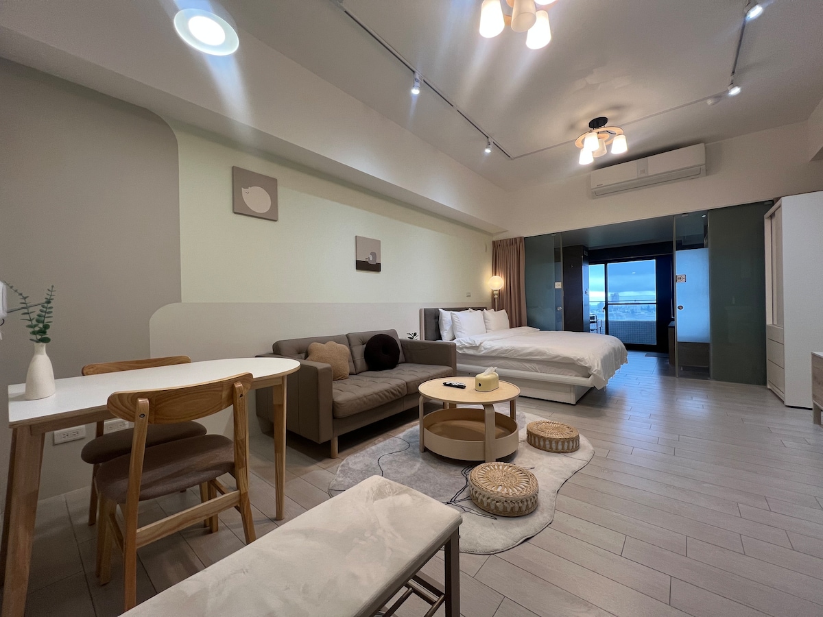 „Besti arkitektúrinn er sá sem við erum í en við vitum ekki hvar náttúran endar og hvar listin hefst.“ Með hreina náttúru og Nanyang yfirbragð sem aðalásinn er vinnugeymslan staflað með steinveggjum og tenóum.Notaðu gegnheiltan við til að sýna hlýlega áferð með fylgihlutum fyrir heimilið, lýsingu og förðunarrýmum til að skapa andrúmsloft. Herbergið er fullt af náttúrulegu andrúmslofti og þægindum með þægilegum dýnum og vönduðum rúmfötum fyrir frábæra svefnupplifun. Það er með litlum einkasvölum og stórum gluggum sem ná frá gólfi til lofts.Hlýlegt sólarljós rennur meðfram gluggunum, næg birta og þú getur tekið fallegar myndir í öllum hornum innandyra.Róleg og rómantísk stemning, jafnvel þótt þú þurfir ekki að fara til útlanda, getur þú notið þess að fara í leti. Hverfið er með reiðhjólaleigu þar sem þú getur skoðað nærliggjandi áhugaverða staði og mat á hjólinu þínu og gengið að brimbrettasvæðinu og Great Pit Seaview Trail á þremur mínútum.Þú getur einnig slakað á í húsinu og í almenningsrýminu með frábæru 360 gráðu fjalla- og sjávarútsýni frá efstu hæðinni, við hliðina á Snow Mountain Mountains og Kyrrahafinu, með útsýni yfir Turtle Mountain Island.Á kvöldin er fallegt útsýni yfir nótt og lágan ljósan himinn.