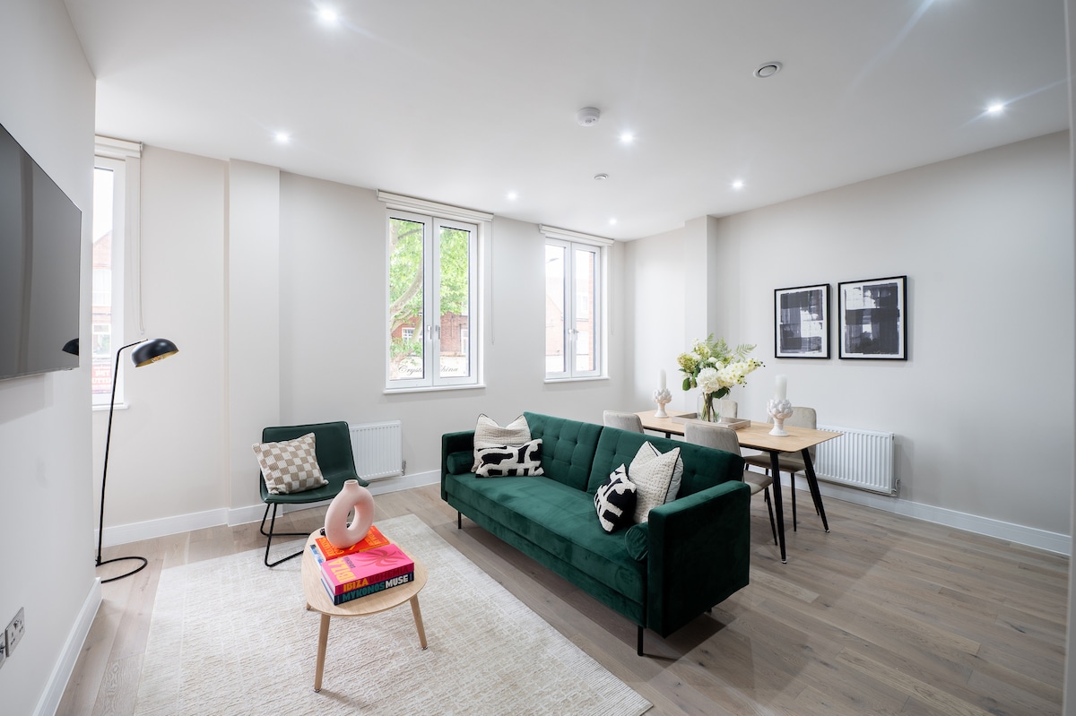 1 svefnherbergi loftkæld íbúð okkar er fullkomin fyrir tvo. Finndu notalega stofu, svefnherbergi með stóru queen-rúmi og HEPA-viftu, baðherbergi með hágæða snyrtivörum, glæsilegu eldhúsi og stórri grænni verönd sem þú getur notið eftir að hafa skoðað London. Nálægt 4 neðanjarðarlestarstöðvum, allt í minna en 10 mínútna göngufjarlægð. Upplifðu London frá heimsfrægum stöðum, spennandi hverfum, notalegum pöbbum við ána, það er alltaf góður tími til að heimsækja!