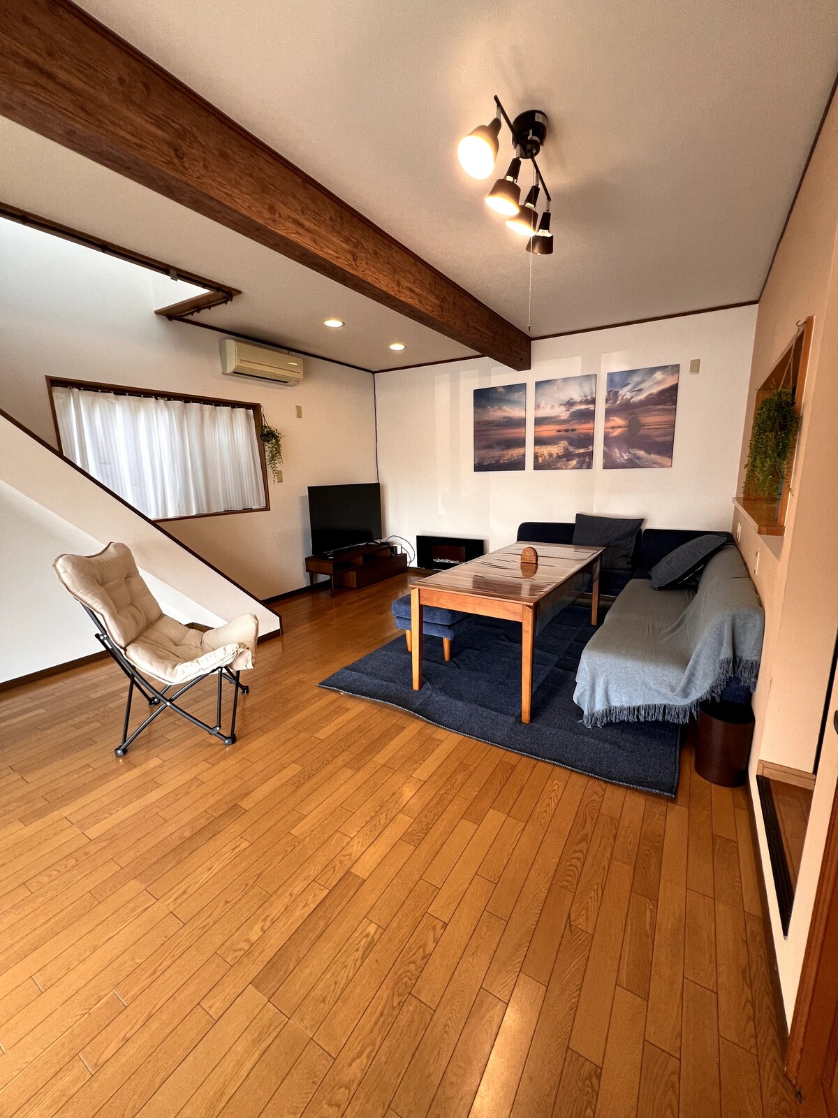 This 132㎡ home has been fully renovated into a modern, luxurious space. It features 3 unique bedrooms, a stylish living kitchen, 2 bathrooms, and 1 sauna. Free parking for 2 cars is available. Located 15 minutes on foot from Toyama Station, 50 minutes by car to the Alpine Route, 1 hour to Kanazawa. After choosing your room, enjoy cooking together in the island kitchen. Refresh in the sauna, share memories over local sake in the cozy living room, and end the day with a deep breath on the balcony.