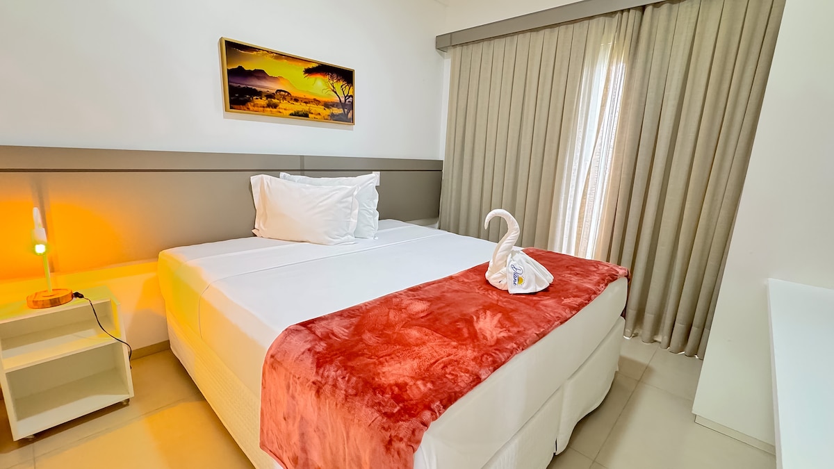 O quarto possui cama casal, ar condicionado, wi-fi, frigobar e banheiro privativo. As roupas de cama e banho serão disponibilizadas e trocadas conforme necessidade.