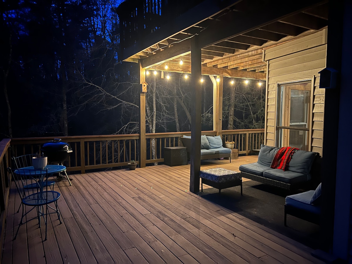 Heillandi íbúðin okkar er staðsett í skóginum með gott útsýni yfir eigin 15 feta foss í bakgarðinum. Njóttu friðar og kyrrðar á meðan þú lest bók í hengirúminu eða hitar upp við chiminea á meðan þú horfir á eldflugurnar dreifast um skóginn. The creek is approximately 3 ft deep at the bottom of the waterfall. Eignin er umkringd fylkisskógi. Ef íbúðin er leigð er lokað fyrir útleigu á afganginum af húsinu. Þú munt ekki deila NEINU rými.