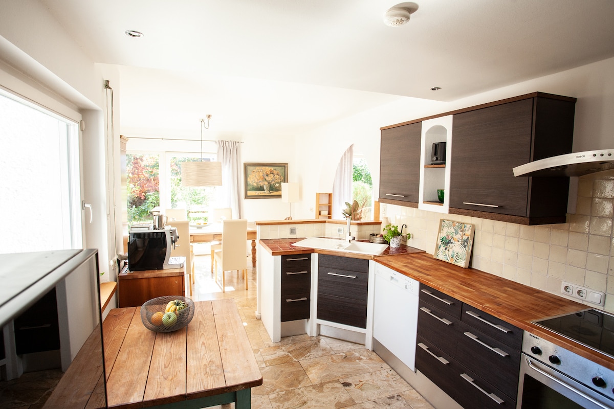 Spacious and stylish Villa for up to 10 guests - perfect for families and groups of friends. Plenty of space to relax and spend time together, with a large garden, covered terrace and sauna. 4 bedrooms with 5 comfortable double beds, a large kitchen and an open dining area. The villa is located in a quiet residential area close to Lake Chiemsee and the Chiemgau Alps. Book now and create memories!