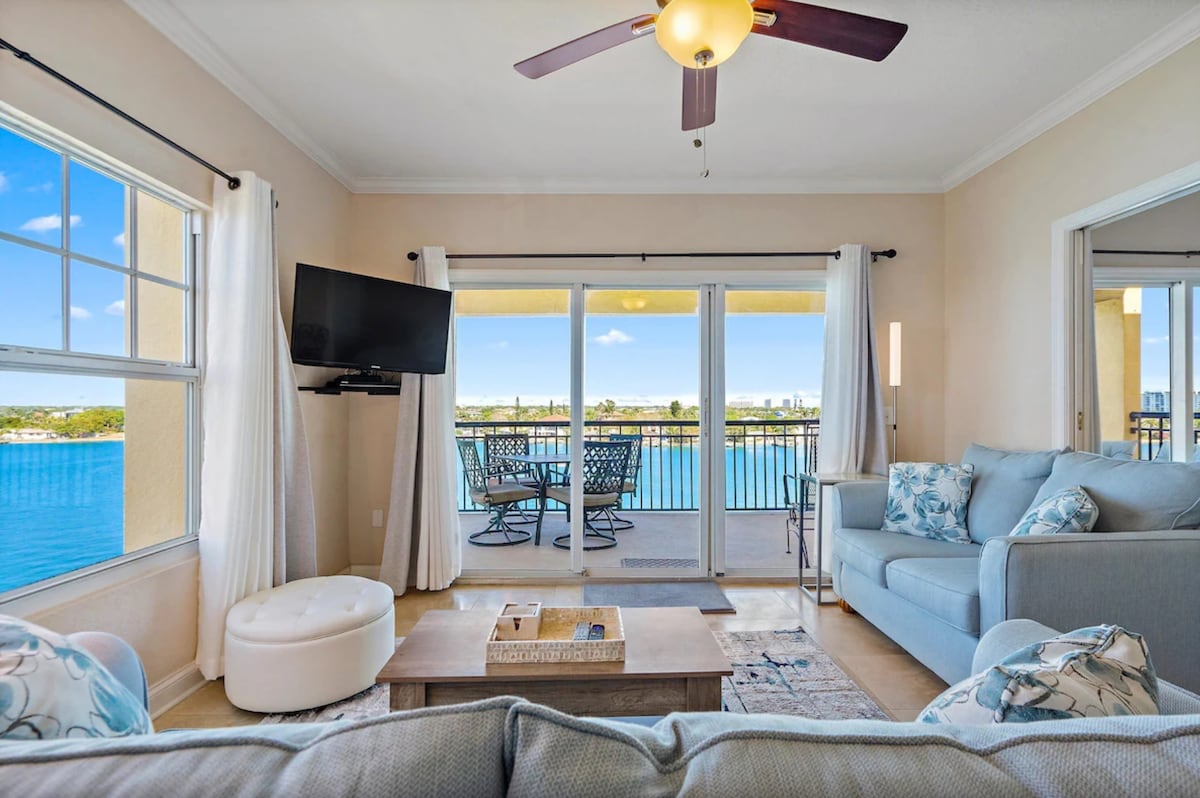 Beautiful 1 BR 1 bath condo with awesome water view of the intercoastal located in Westwinds Waterfront Resort 800 square feet with large living area including 65 in tv, queen sofa sofa, full kitchen, king bed in master. Stutt að ganga að strönd Treasure Island. Matvöruverslun, veitingastaðir og barir í göngufæri. Dvalarstaðurinn er með upphitaða sundlaug, tvö gasgrill, lyftur og 3 bryggjur og friðsælt svæði til að sitja og horfa á vatnið. Bátar allt að 24’ velkomnir með bókun.