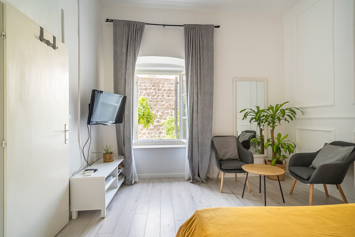 Okkur er ánægja að bjóða þér íbúð í gamla bænum í Dubrovnik. Þessi loftkælda íbúð rúmar 2 einstaklinga. Í íbúðinni er eitt stórt svefnherbergi með king size rúmi, eldhús með öllum nauðsynlegum áhöldum og fylgihlutum, borðkrókur og baðherbergi með sturtu. Hér er einnig lítil verönd og stór verönd undir þrúgunni, umkringd fallegum garði innan sögulegu borgarmúranna, sem er tilvalinn til að drekka morgunkaffi og drekka vín á kvöldin. Íbúðin er einnig búin Sat-TV, þráðlausu interneti og þvottavél. Vinsamlegast sendu okkur tölvupóst fyrir frekari upplýsingar um íbúðina. Einnig bíður þín móttökukarfa!