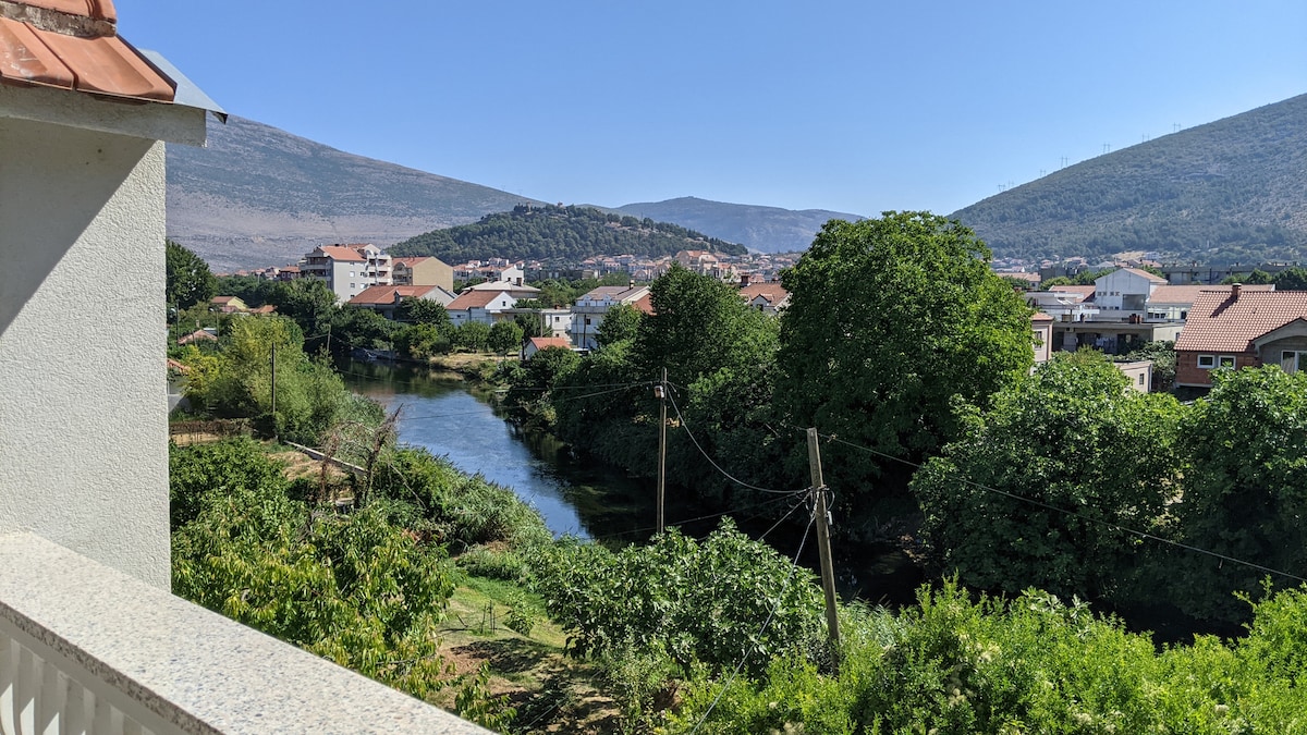 Our studio apartment is some 10-15 minutes of a leisurely walk along the river to the old town. The modern apartment has beautiful views over the Trebisnjica river and surrounding hills and it is in a very peaceful part of town. The layout is open-plan with kitchen/living space connected to the bedroom and as it is an attic the tall ceilings and windows provide plenty light. Fully furnished and with hosts that speak multiple languages. Gated and secure free parking available.