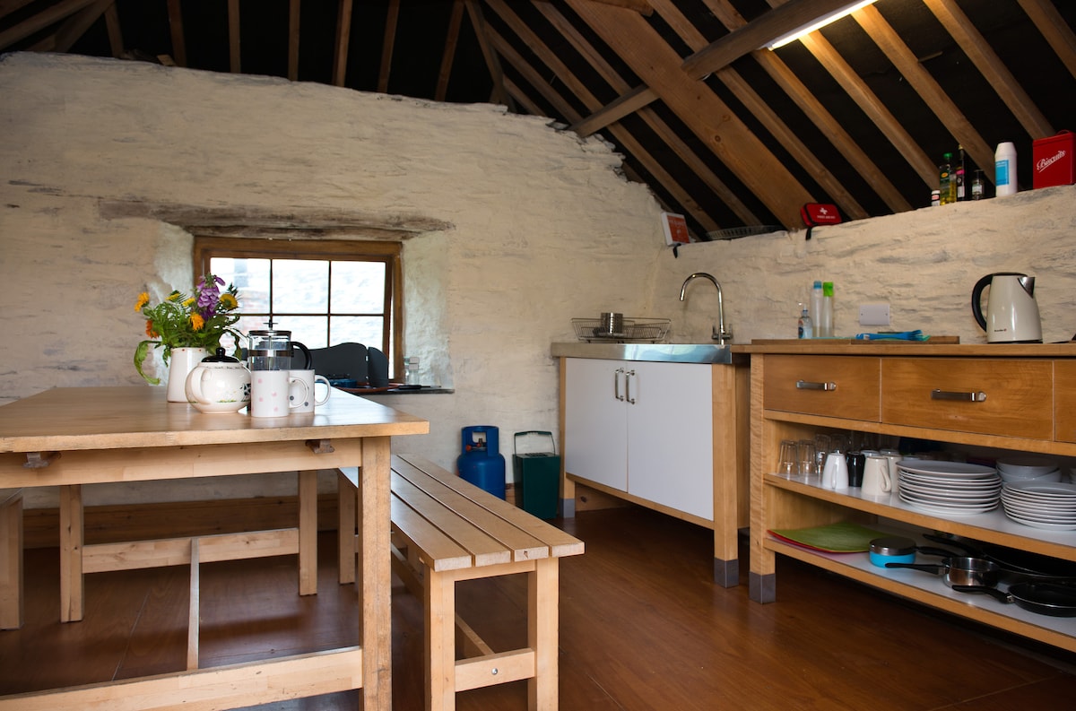Hlaðan er fullkomið frí fyrir par. Rúmgóð opin hlaða með eldhúsi og stofu, flaggsteinsgólfi og lofthitun á gólfi og svefnpalli fyrir ofan. Flottur, sjálfstæður sturtuklefi. Stórt bókasafn og safn af borðspilum og víðáttumiklum görðum og lóðum. Göngufjarlægð frá ströndinni í gegnum laufskrýddar Cornish-brautir - stígurinn við suðvesturströndina er í 1,6 km fjarlægð. Tekur þú hund með? Vinsamlegast hafðu samband við bókun. Gæludýragjald á við (£ 45) að fengnu samþykki