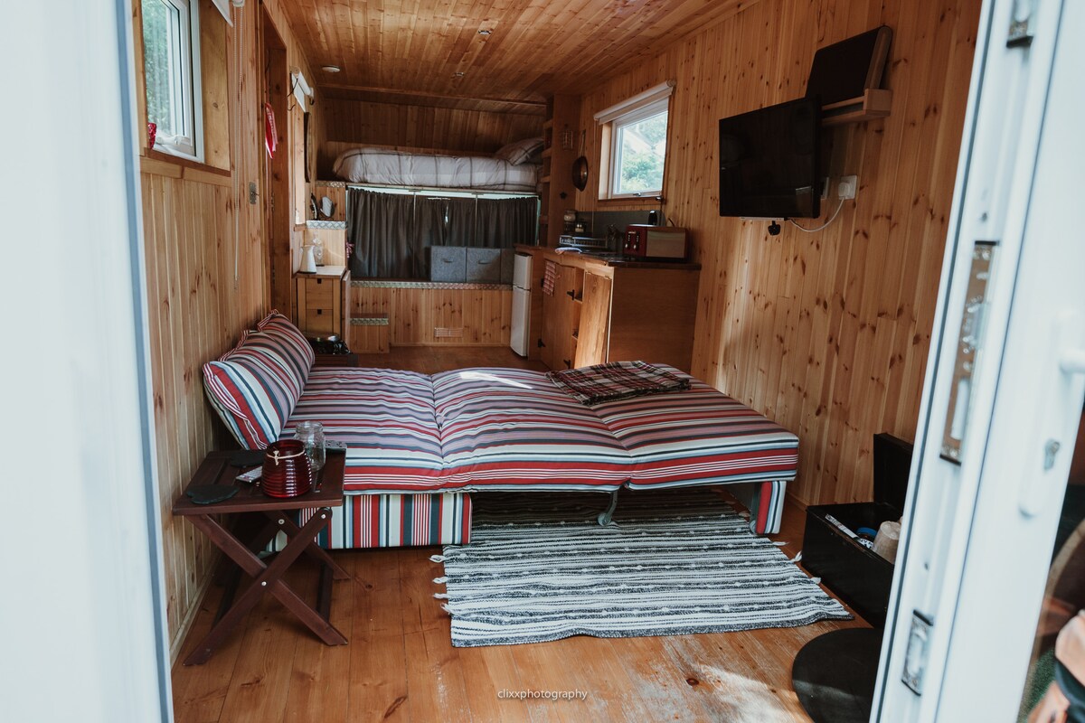 On the Southern Edge of BBNP, this beautifully renovated horse box provides a comfortable, compact & modern space. Smart TV, log burner, above the driving cab bed and bed sofa. Secure bike lock up. Perfect setting for small families or romantic getaways. Peaceful private outdoor space. 10 mins to Bike Park Wales. 30 mins to Cardiff & Swansea. Walking & relaxing in the country side. EXTRA COSTS HOT TUB (vary) LOGS (£1 each) PETS EXCESS MESS