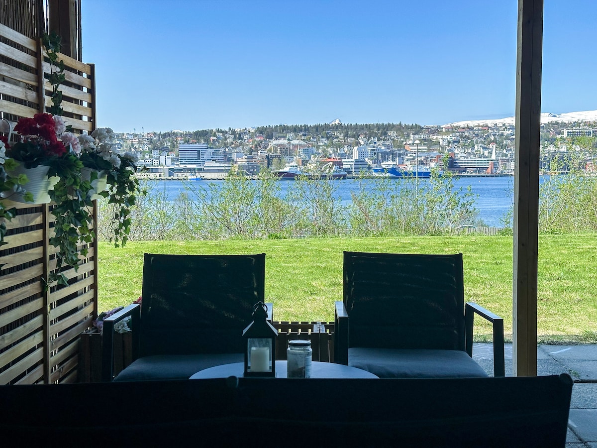 Stílhrein íbúð á efstu hæð við sjóinn í miðbæ Tromsø með glæsilegu útsýni yfir Arctic Cathedral, Tromsø Bridge, Cable car, miðnætursól og norðurljósin. Njóttu þess að sigla inn í Hurtigruta frá svefnsófanum og heyra öldurnar lepja fyrir utan. Inngangurinn er hluti af glerjuðu verönd með útsýni til suðurs. Miðstöðin er í 10 mínútna göngufjarlægð. Íbúðin er opin, notaleg og góður og þægilegur staður til að eyða tíma þínum. Aldurstakmark til leigu: að lágmarki 25 ár. ENGAR REYKINGAR AF NEINU TAGI.