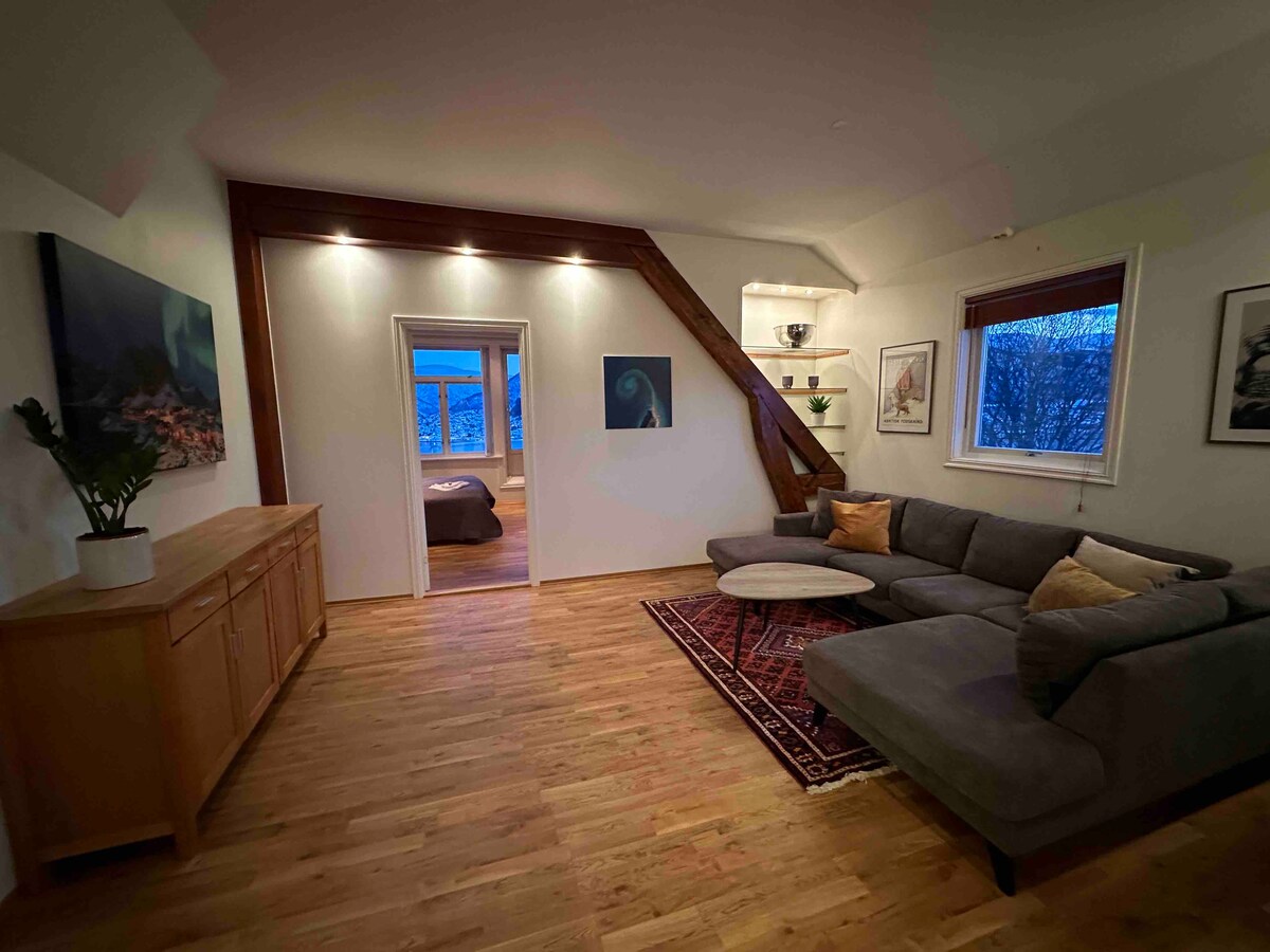 Retreat to this cozy attic. And be able to enjoy the northern lights from bed! Two studioapartments, with bathroom. Stunning view, over sea and moutains. Excellent hiking and skiing trails, very close by. Warm up in the bathtub, between your arctic adventures! Microwave oven, fridge, and Tv with apple-tv Very good bus connection. Two minute walk from bus stop. Approx. 22 min bus ride to city centre. Free parking. Pizzeria and super marked nearby.