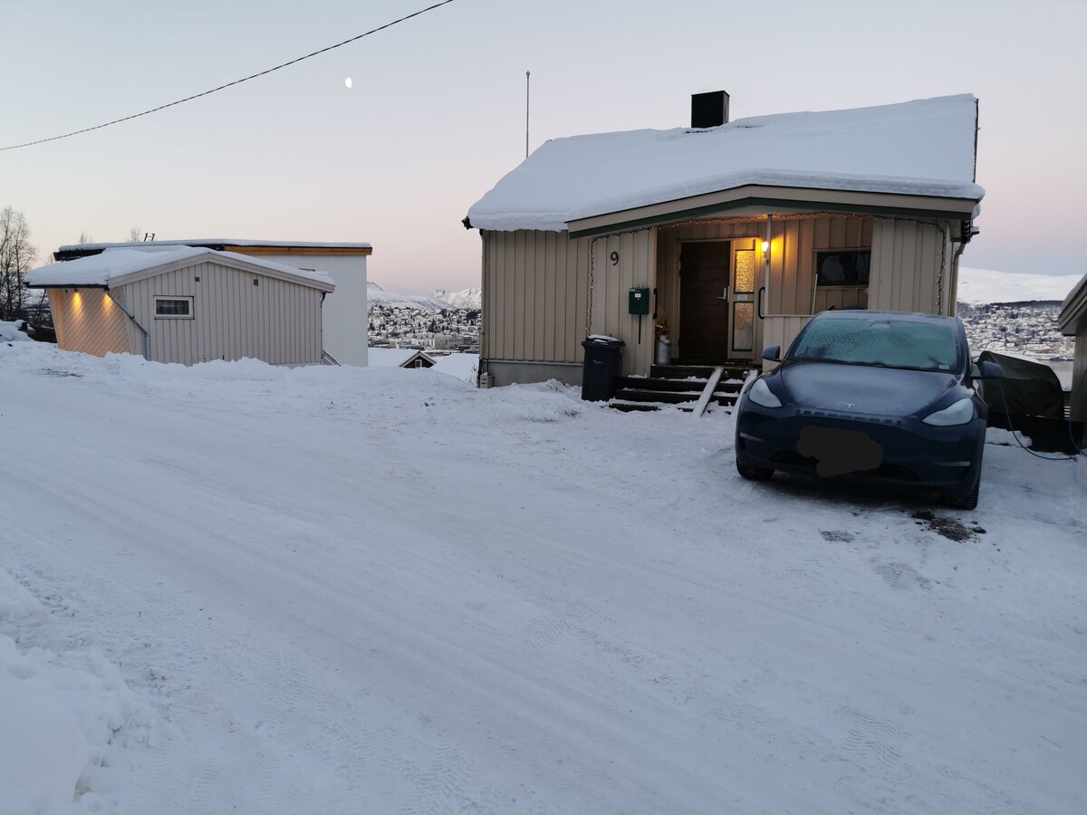 Þægileg og friðsæl gisting á fallegum og miðlægum stað fyrir allt að tvo. Hér hefur þú allt sem þú þarft fyrir stutta eða lengri dvöl í Tromsø. Strætisvagn (nr. 24) fer beint fyrir utan húsið og tekur um 10 mínútur fyrir miðju. Ef þú vilt frekar ganga tekur það um 30 mín. Íbúðin er nýuppgerð með sér baðherbergi og sambyggðri stofu/svefnálmu. Hér er ekki fullbúið eldhús. Sem gestir okkar er þér velkomið að nota garðinn með okkur. Frábær staður til að sjá norðurljósin frá!