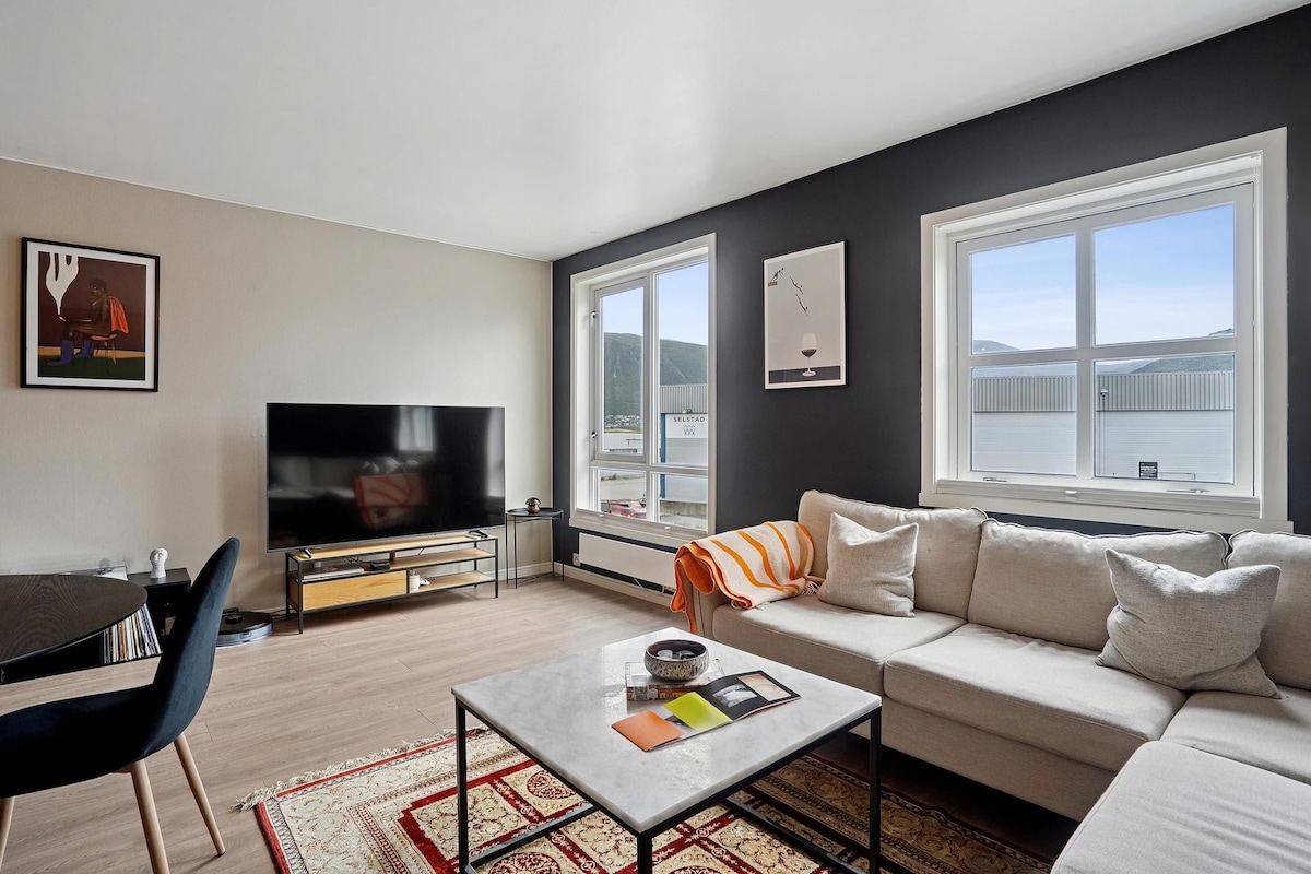 Þriggja herbergja ný íbúð á 90 fm með útsýni yfir fjörðinn, Arctic dómkirkjuna, fjallstindastaðinn og brúna milli meginlandsins og eyjarinnar. Miðsvæðis milli Tromsø borgar og UNN / UIT. Göngufæri við miðborg Tromso og góðar rútutengingar. Ef þú ferðast með lítið barn getum við boðið þér barnarúm, barnastól, pott, leikföng og barnavagn. (áskilið fyrirfram) Allt sem þú þarft fyrir þægilega dvöl þína. ❤️😊