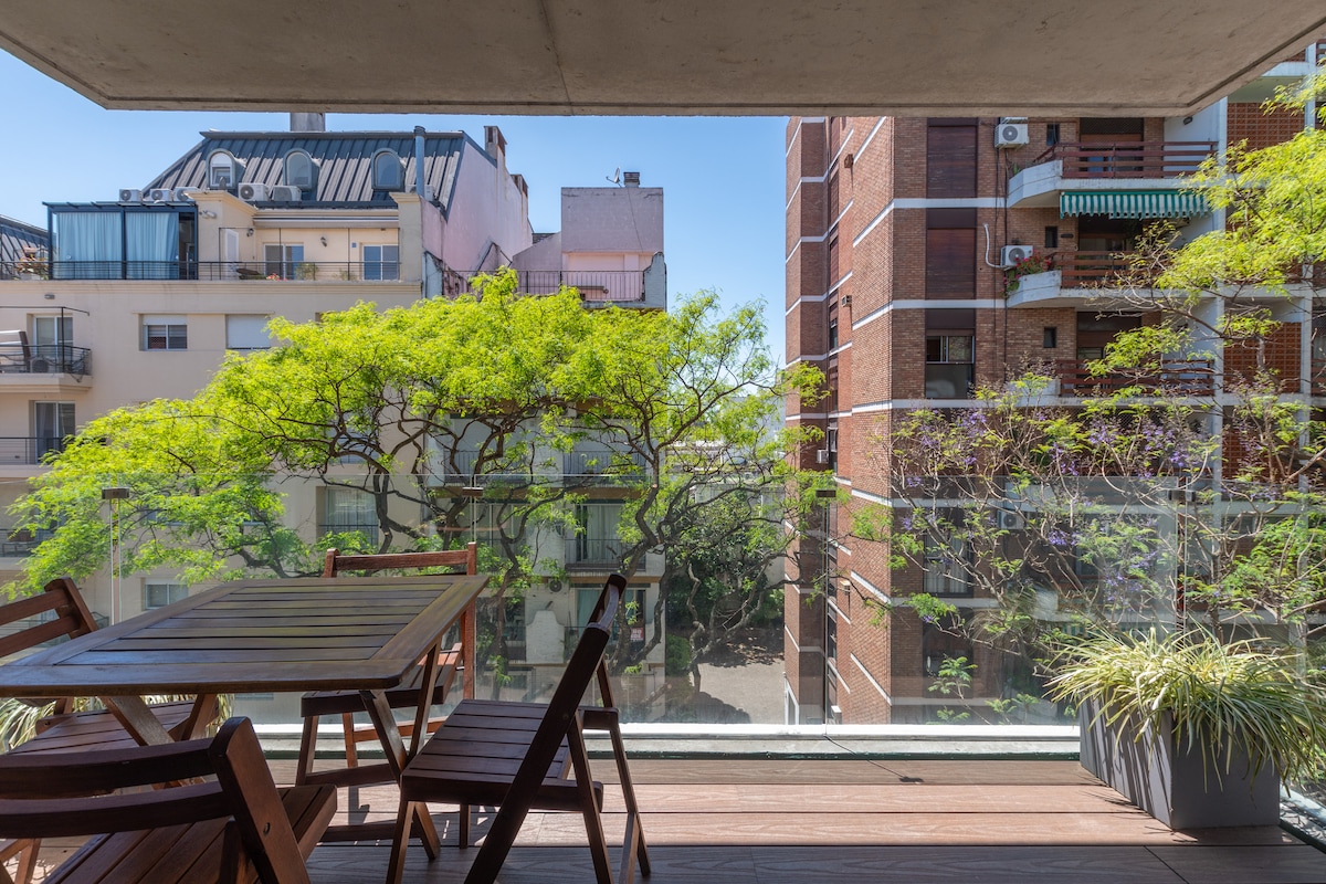 El departamento tiene dos ambientes con cochera descubierta en el edificio. Es acogedor y tranquilo, con grandes ventanales que llenan de luz y verde. En el living hay un smart tv de 42’ y conexión wifi. La cocina está bien equipada. El dormitorio es amplio, con cama doble y placard en el pasillo, el baño tiene bañera. El balcón arreglado con plantas y una pequeña mesa con sillas invitan a relajarse tomando un bebida. Sábanas y toallas. La Pileta tiene deck con reposeras , es de uso común.