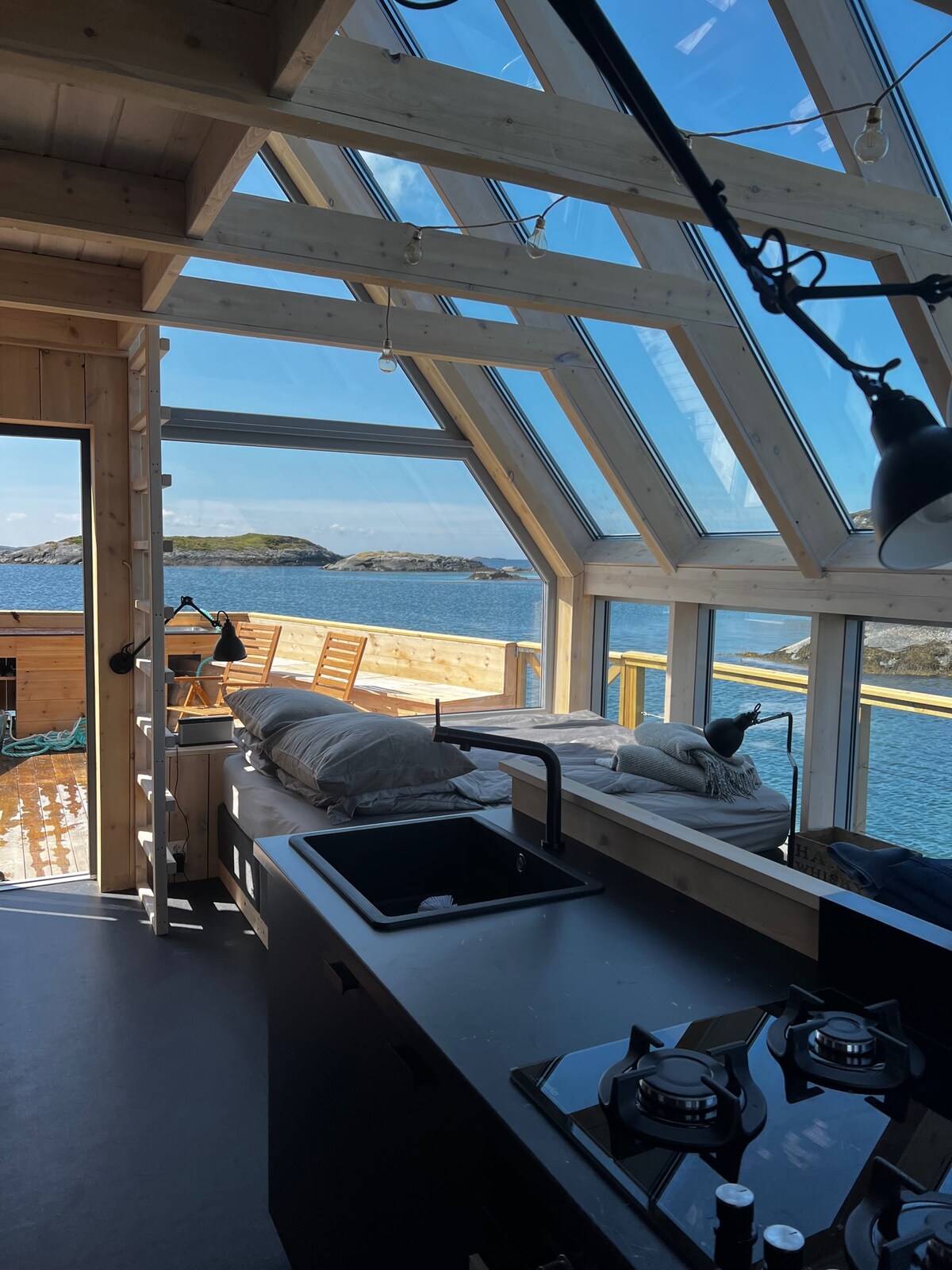 Einstakur kofi að framan við sjóinn. Mjög nútímalegt og fullbúið. Ótrúlegt útsýni yfir fjörðinn. The cabin is located 10-15 min outside the city center, with bus departure every hour. Strætisvagnastöð í 1 mín. fjarlægð. Skálinn er 28 m2 stór og er í boði fyrir allt að 2 manns. Á efri hæð með rúmi með stigaaðgengi og þægilegum svefnsófa fyrir neðan. Ókeypis bílastæði við veginn og aðeins 1 mínútu gangur niður litla hæð að húsinu. Nuddpotturinn kostar aukalega en það fer eftir því hve marga daga hann er. Engar reykingar og engar veislur.