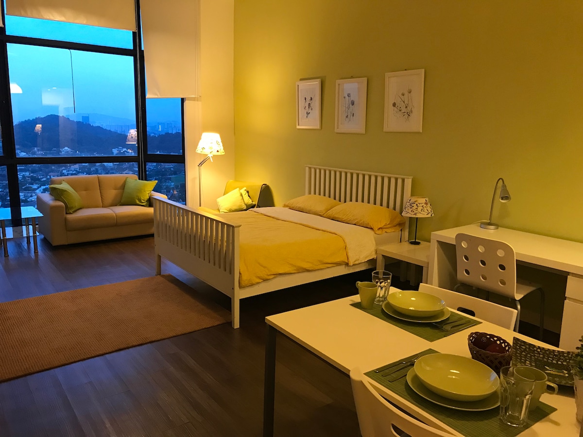 Bright studio, on level 27 with views of KL city skyline & the lake. Peaceful suburb, 7km to KL city. 20-min train ride to KLCC and 10 mins to KL Sentral. 7-min walk to train station. 100mbps unlimited data WiFi. Android TV & Netflix. Single induction hob, hood and cooking utensils in a kitchenette A well-loved unit, guests mostly are long stayers. 30 odd-year old building but my unit is modern, clean & with adequate amenities DIRECT ACCESS to mall for supermarket, etc.