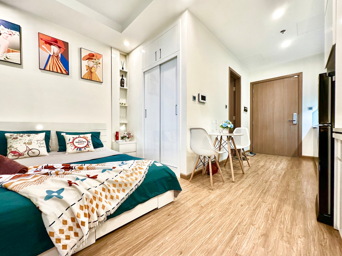 Íbúðin er staðsett í háklassa íbúðasamstæðunni Vinhomes Greenbay Me Tri, 400 Luong The Vinh, Nam Tu Liem, Hanoi. Staðsetningin er mjög nálægt innlendum stjórnsýslumiðstöð, Grand Plaza, kóreska sendiráðinu, My Dinh Stadium,... The nothæf svæði Studio er 30 m2, þar á meðal 1 baðherbergi, 1 hjónarúm. , eldhús með ísskáp, framkalla eldavél, örbylgjuofn.. Að auki er sundlaug, líkamsræktarstöð, leiksvæði fyrir börn. Þess vegna mun þér líða mjög friðsælt, öruggt og þægilegt