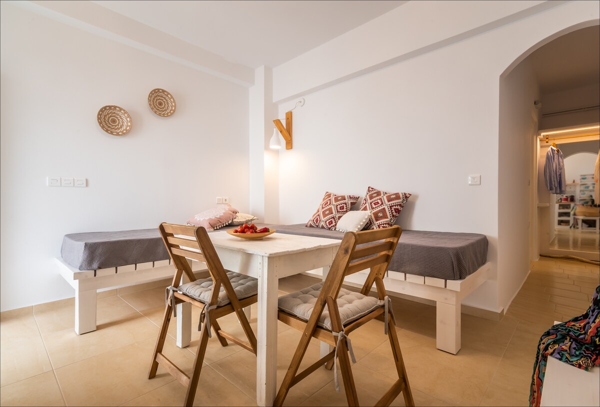 Velkomin í ykkar einkavin á hinni fallegu eyju Milos! „Studio Unique“ okkar býður upp á friðsælt, sveitalegt umhverfi á rólegu svæði í Parasporos, tilvalið fyrir sannan slökunarfrí. Þessi fullbúna stúdíóíbúð býður upp á fullkomna blöndu af ró og þægindum. Þú verður í stuttri akstursfjarlægð frá iðandi höfninni í Adamas og þekktustu ströndum eyjarinnar sem gerir hana að tilvöldum upphafsstað fyrir skoðunarferðir.