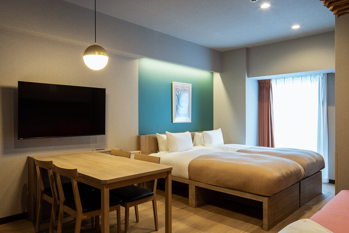Fullkominn grunnur til að prófa allt það sem Tókýó hefur upp á að bjóða. Tvíbreiðu rúmin og valfrjálsar kojur rúma allt að 4 manns svo að enginn verði skilinn eftir. Risastórt borðpláss fyrir 4 með nauðsynjum eldhúsáhöld til að útbúa hvers kyns máltíð. Búin með 2-í-1 þvottavél svo að þú verður alltaf fersk og hrein/ur fyrir næsta ævintýri. Hvert herbergi er með staðbundna list í gegnum linsu íbúa Tókýó, gluggann þinn til að upplifa bestu borg á jörðinni.