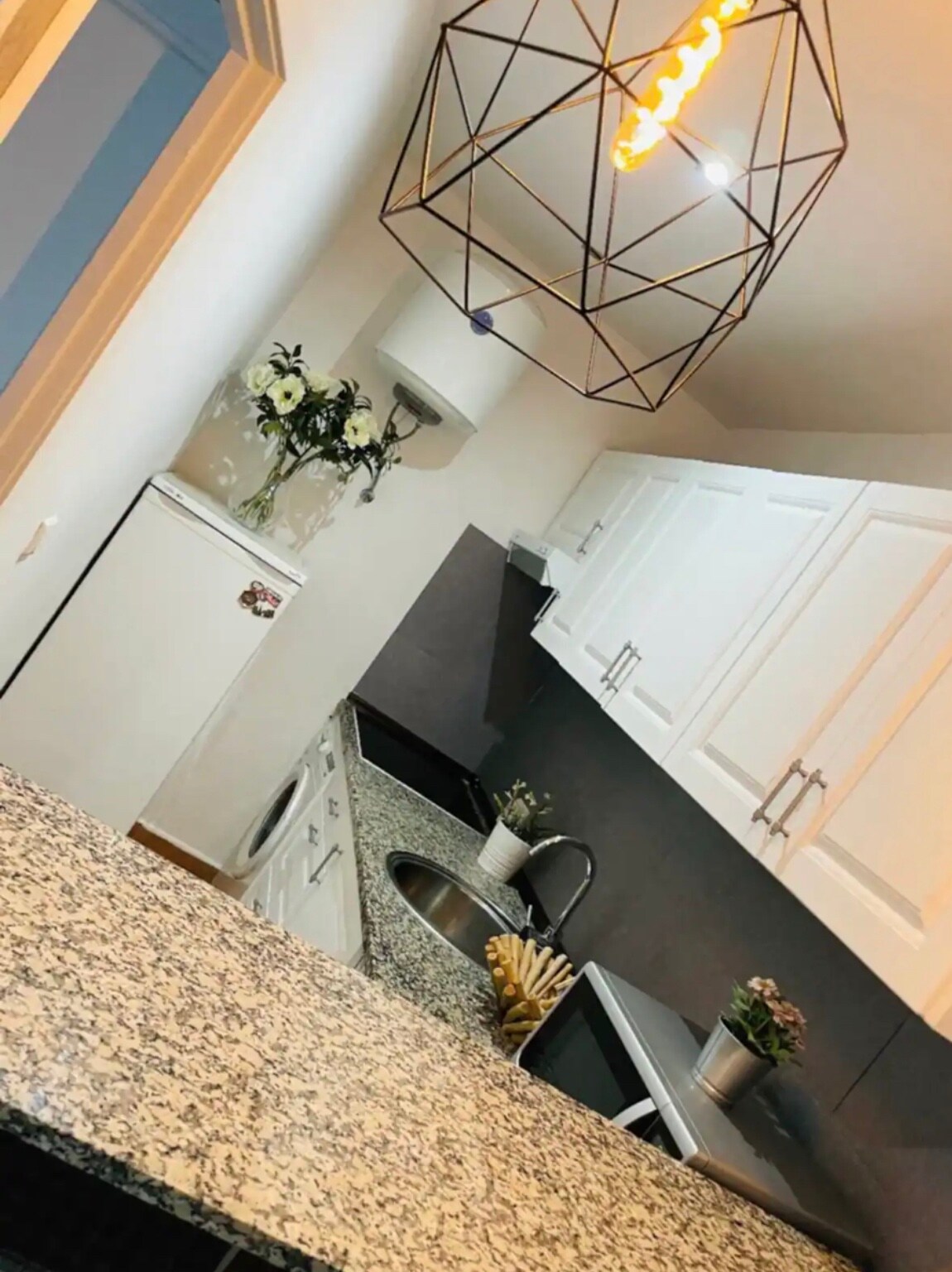 Ný þakíbúð, svefnherbergi með skáp og sjónvarpi. Einstaklingsherbergi með þægilegum svefnsófa, skrifstofuaðstöðu og sjónvarpi með Netflix. Stofa með eldhúskrók og þægilegum svefnsófa fyrir tvo . Hann er þakíbúð með fallegri verönd. Upphitun og fullbúið ástand. Straujárn, brauðrist, samlokugerð, kaffivél, rafmagnssafi, ísskápur, örbylgjuofn, þvottavél, þvottavél, hárþurrka, eldunaráhöld og rúm. Fiber Internet (High Speed)