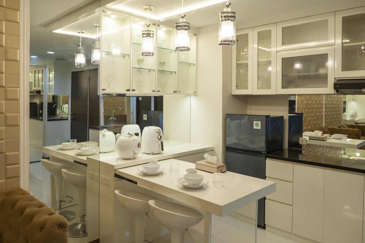 Verið velkomin á The Reserve, fágað afdrep í miðborg Gading Serpong, steinsnar frá Summarecon Mall Serpong og áhugaverðum stöðum í nágrenninu. Þetta 45m2 glæsilega stúdíó er staðsett í MTown Apartment Complex og blandar saman nútímalegum þægindum og lúxus með glæsilegum innréttingum, latex-rúmi og glæsilegu baðkeri úr gleri fyrir heilsulindarupplifun. Eldhúskrókurinn er þægilegur fyrir rólega kvöldstund. The Reserve er fullkomlega staðsett og úthugsað og er tilvalin afdrep fyrir afslöppun/viðskipti.