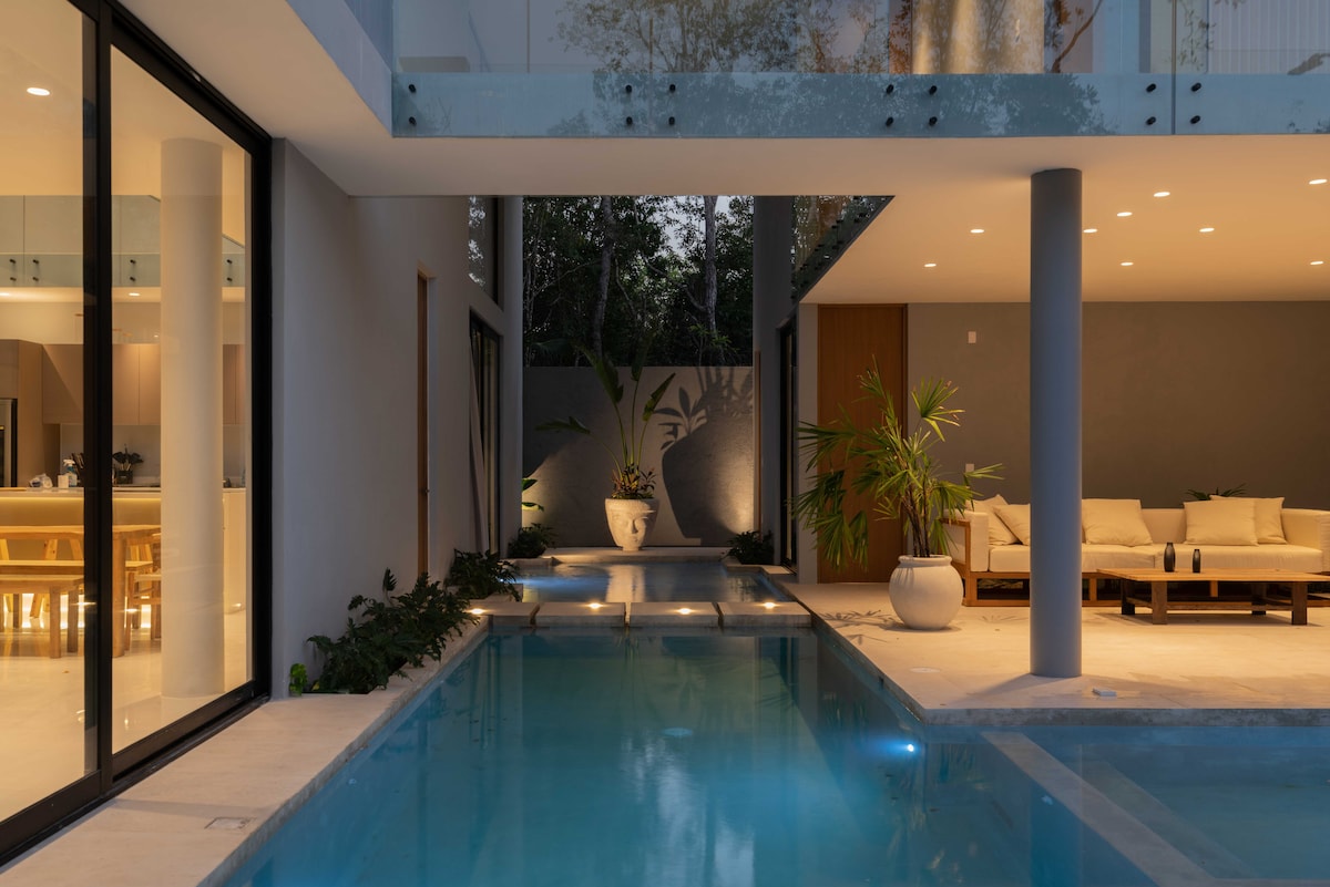 • FRÁBÆR STAÐSETNING! 10 mín frá Tulum sandströndum • ÖRYGGISGÆSLA allan sólarhringinn - Samfélag bak við hlið • VIP einkaþjónusta (án endurgjalds) • Þrif í miðri dvöl fyrir alla gistingu (án endurgjalds) • 4 svefnherbergi með baðherbergjum (2 Kings & 2 Queens), hvert með sér baðherbergi • Svefnpláss fyrir allt að 9 gesti • EINKASUNDLAUG • ÞAKPLÖTU • Loftviftur í hverju herbergi • Trefjar Hröð nettenging • Fullbúið eldhús • Kemur fyrir í Dezeen, AD, Vogue og Elle Decor.