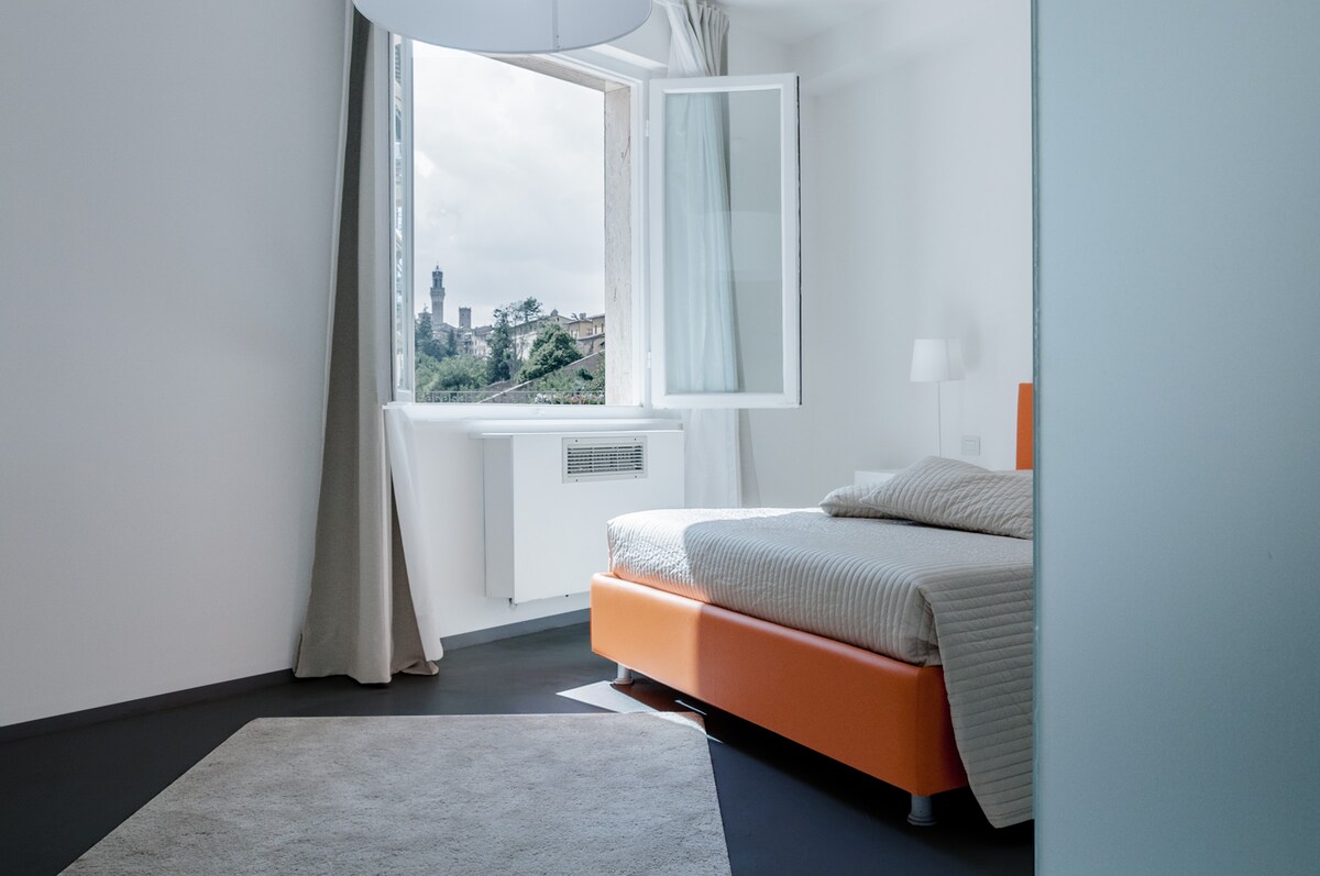 Sökktu þér ofan í fáguð þægindi í glæsilega herberginu okkar á San Prospero Heritage. Njóttu rúmgóðs, bjarts herbergis með king-size rúmi, hönnunarinnréttingum og íburðarmiklu travertínbaðherbergi. Vertu í sambandi með hröðu þráðlausu neti, slakaðu á með Netflix í snjallsjónvarpi og njóttu snurðulausrar sjálfsinnritunar. Staðsett í heillandi byggingu í Liberty-stíl, í fallegri göngufjarlægð frá sögulega miðbænum í Siena.