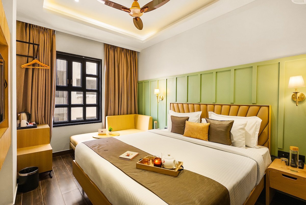 Sérherbergi í sögufrægrri byggingu í gamla bæ Udaipur, staðsett við heillandi, þrönga stræti nálægt Pichola-vatni og City Palace. Rúmgott fyrir 2 fullorðna + 1 barn með einu king-size hjónarúmi, svölum með útsýni yfir hæðir og borgina, vestrænu baðherbergi með öllu nauðsynlegu og setusvæði utandyra. Njóttu kvöldverðar á þaki með útsýni yfir Lake Palace, City Palace, Jagmandir, sólarupprás og sólsetur. Bílastæði, reiðhjólaleiga og skoðunarferðir í boði (gegn gjaldi). Leitaðu að okkur á Google til að fá umsagnir, Hotel Lake Star Bistro. 77376&23235