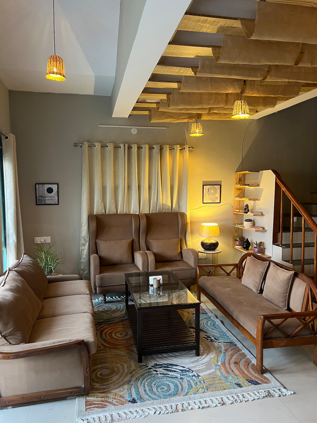 Nestled among lush hills, this serene 1BHK retreat is perfect for couples or small families. Enjoy a sunlit living area with cozy seating and warm wooden tones. The bedroom features a king-sized bed and large windows framing beautiful hill views.A compact kitchen and dining space add convenience. Thoughtfully designed with calming interiors, this peaceful escape blends comfort, simplicity, and the beauty of nature.