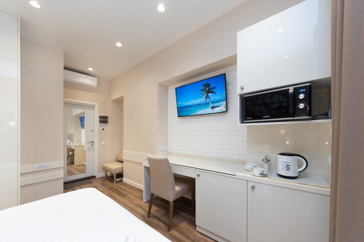 Íbúð með einu herbergi í minimalískum stíl. Stærð íbúðarinnar er 15 fermetrar. Það er stöðugt heitt vatn úr 80 lítra katli. Íbúðin er á þriðju hæð án lyftu. Það er gott WiFi og sjónvarp með nettengingu. Í íbúðinni er ekkert eldhús. Það er aðeins örbylgjuofn og ketill, auk alls sem þarf til að útbúa salat.